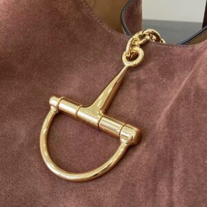 Its defining detail is the polished gold-tone Horsebit hardware (a signature Gucci motif) attached to the front via a small chain, which also secures the suede tab closure.