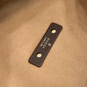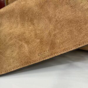 A sleek gold-tone zipper (with a branded pull) accents the detachable suede pouch (embossed with the “GUCCI” logo) included with the bag, adding practical storage.