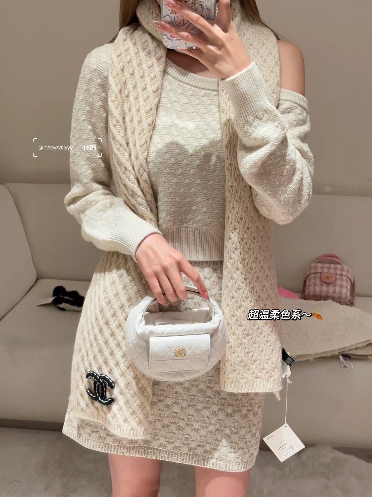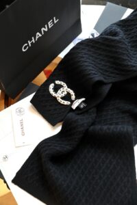This chic scarf draws inspiration from Chanel’s iconic aesthetic, crafted from a soft, textured cable-knit fabric (available in classic black and cream tones).