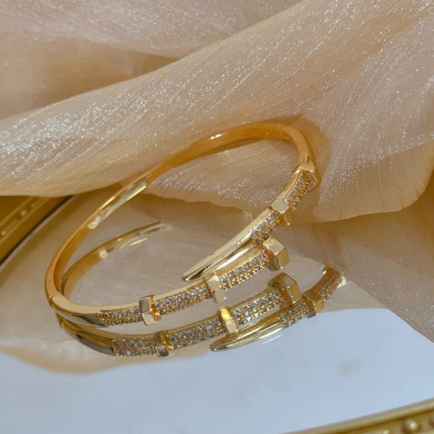 The design reimagines a nail as luxury jewelry: the bangle features a “nail head” motif (fully encrusted with pavé-set round diamonds) and diamond-pavé detailing along the band, paired with geometric gold accents for a bold, industrial-chic silhouette.