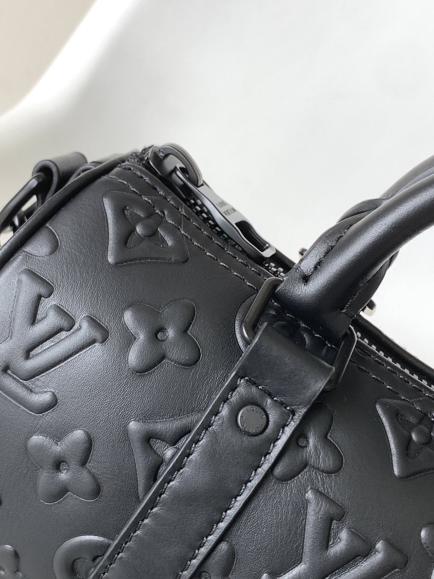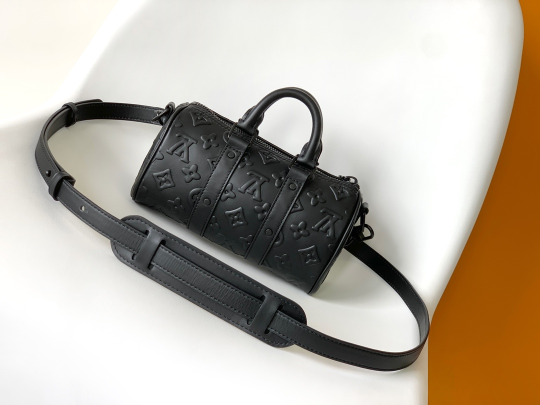 This is the Louis Vuitton Keepall XS—a miniature duffel (often called a “pillow bag”) crafted from black Monogram Seal leather (featuring embossed LV Monogram motifs for a textured, understated look).