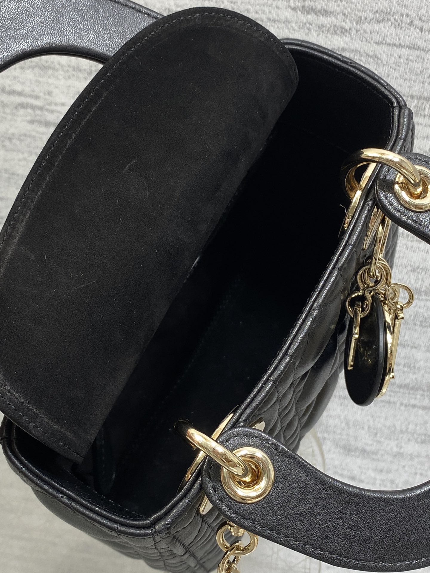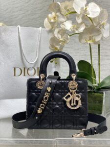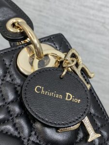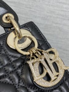 • Hardware & Charm: Polished gold-tone hardware includes a showstopping “D.I.O.R” charm (encrusted with sparkling crystals) attached to the handle’s ring, plus a small black leather tag embossed with “Christian Dior.” The handle’s gold-tone rings are engraved with the “CD” monogram.