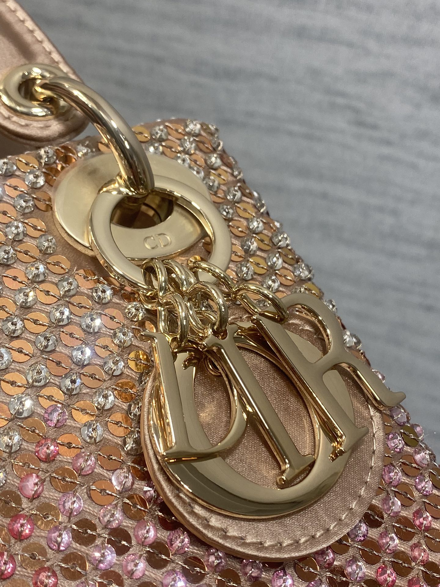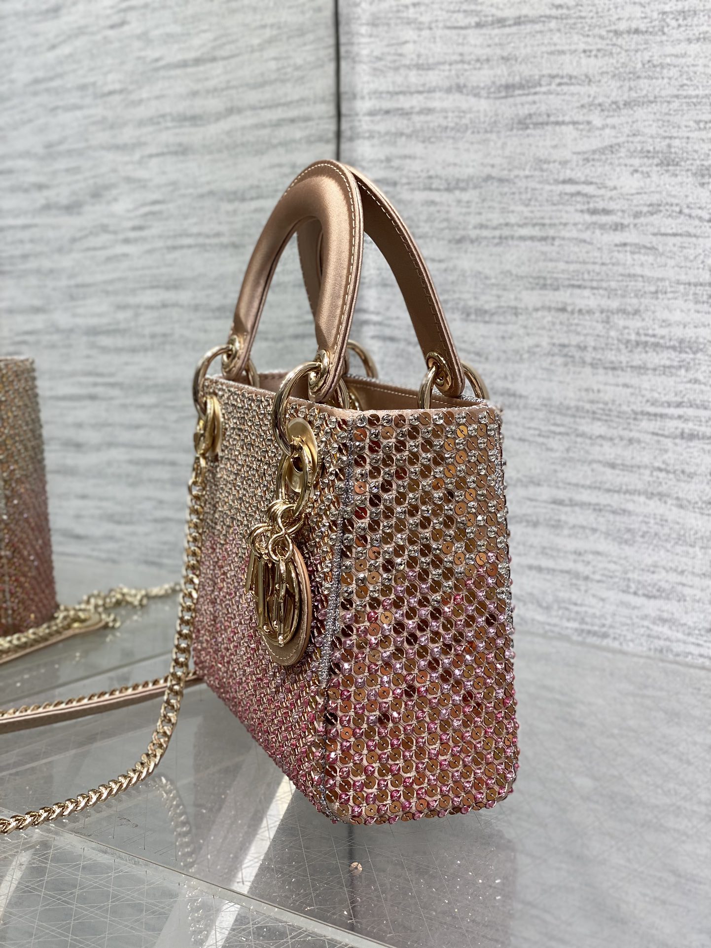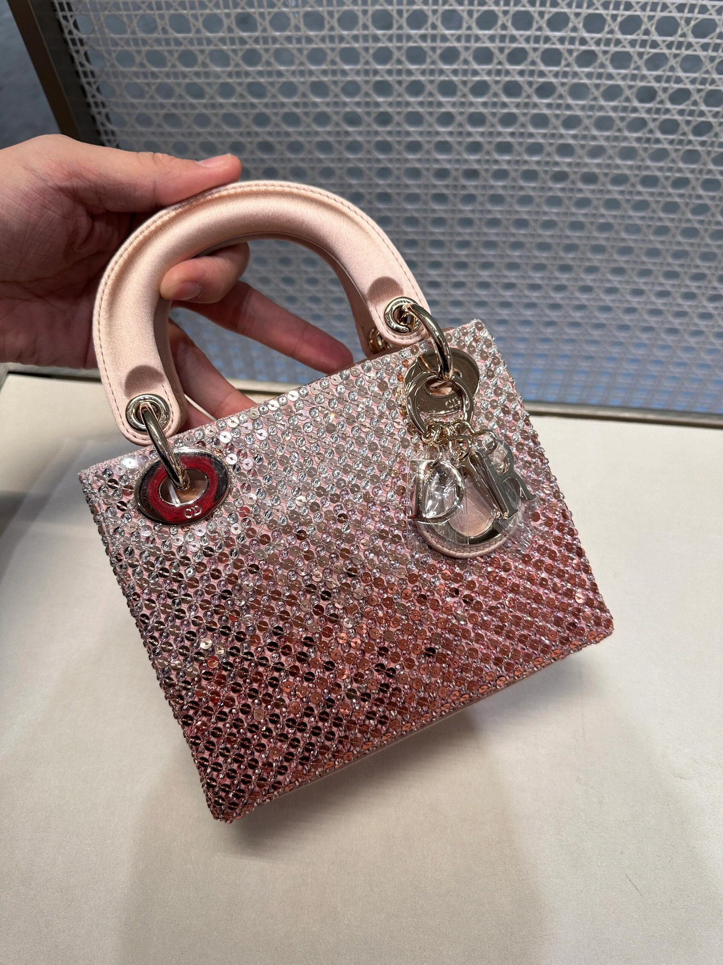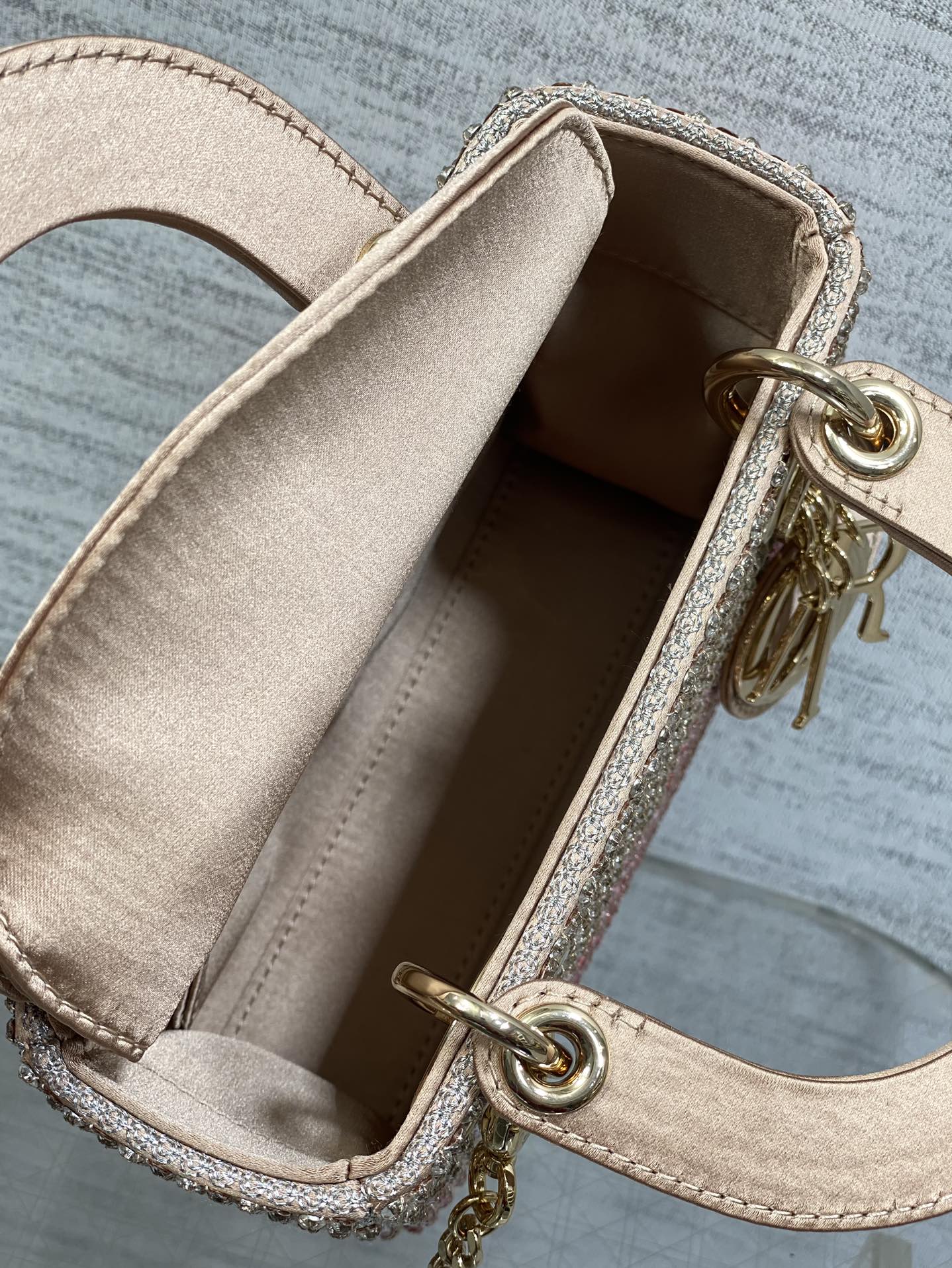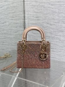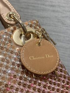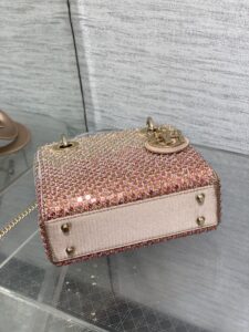 Material & Color: Crafted from fabric entirely covered in pink and clear crystals (arranged in Dior’s signature cannage quilt pattern), creating a high-shine, textured finish. The top handle and interior lining are made of soft, matching pale pink leather/suede-like material.