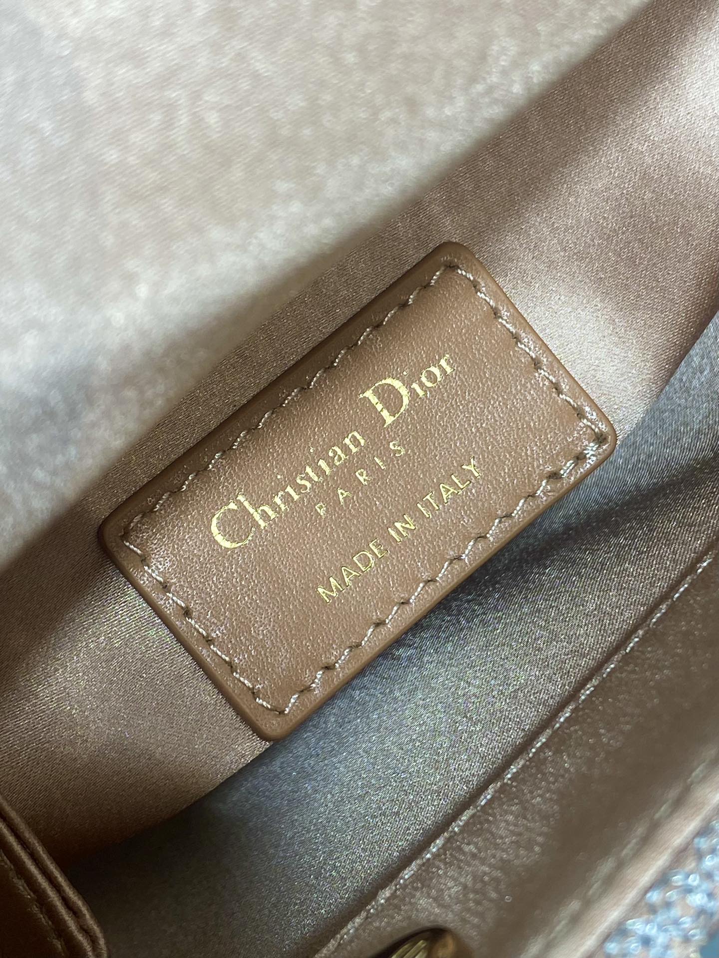 Branding & Craftsmanship: An internal leather label marked “Christian Dior PARIS MADE IN ITALY” confirms its premium quality and authentic luxury construction.