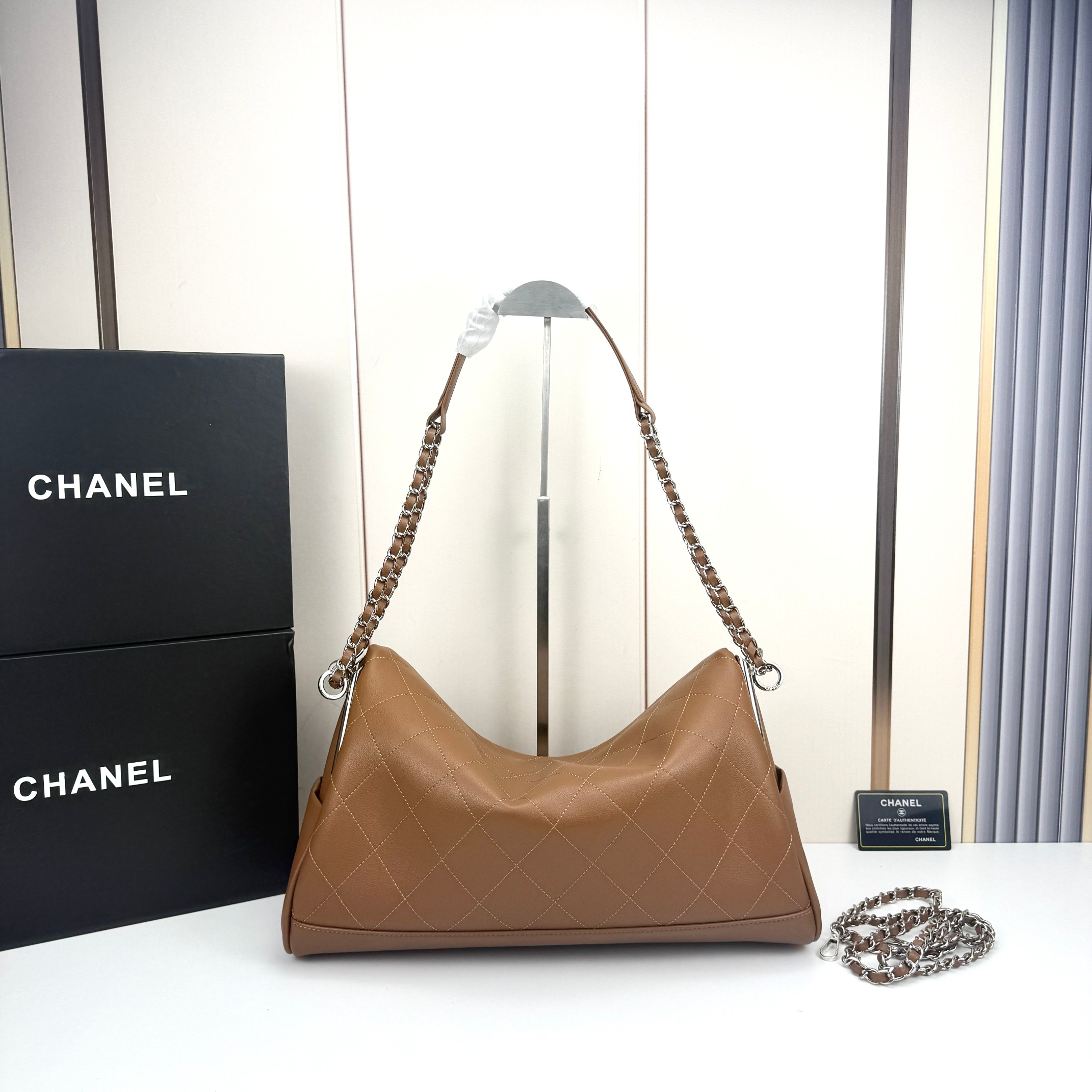 This is the Chanel Large Hobo Bag, crafted from buttery-soft caramel calfskin leather featuring the brand’s iconic diamond-quilted stitching in a subtle tonal finish.
