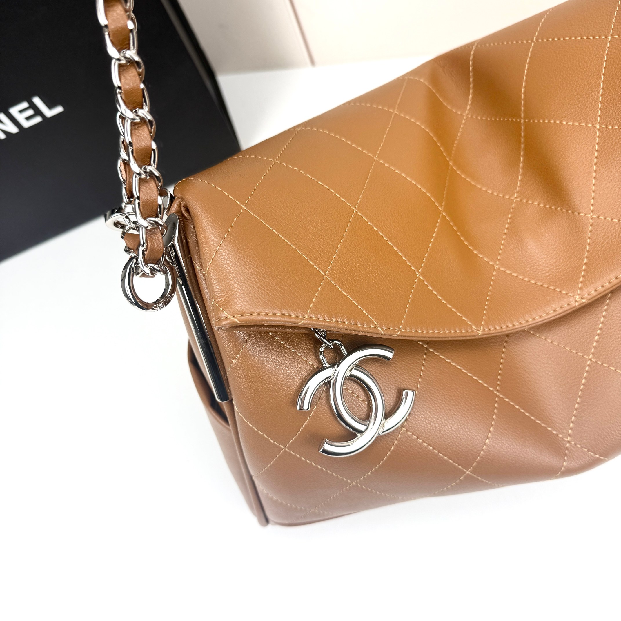 It is finished with polished silver-tone hardware, including the iconic interlocking CC charm that hangs from the front flap, a hallmark of Chanel’s timeless design.