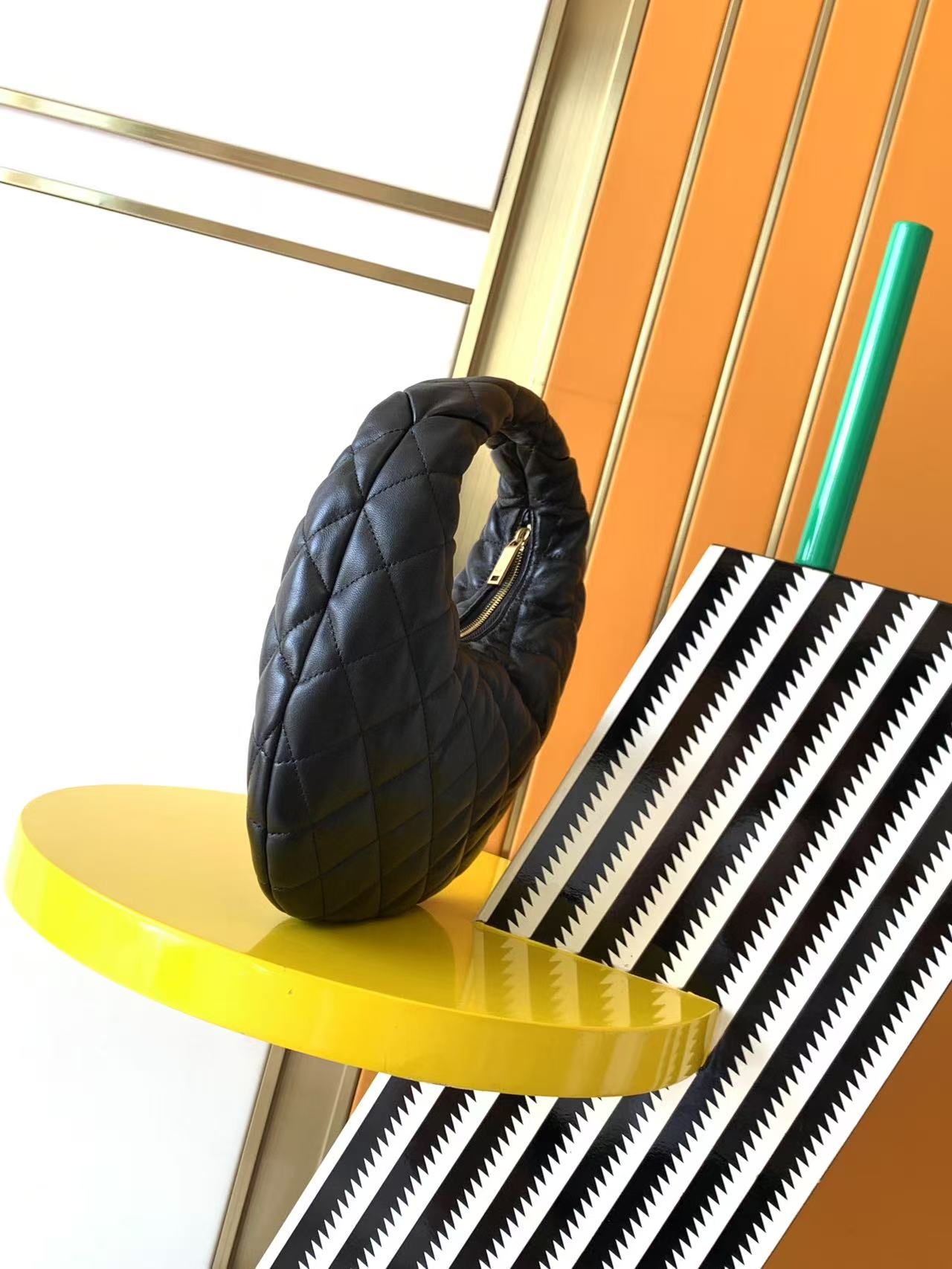 • This is the Saint Laurent Le 5 à 7 Mini Hobo Bag, crafted from soft black calfskin leather with the brand’s signature diamond-quilted stitching, creating a plush, tactile finish.