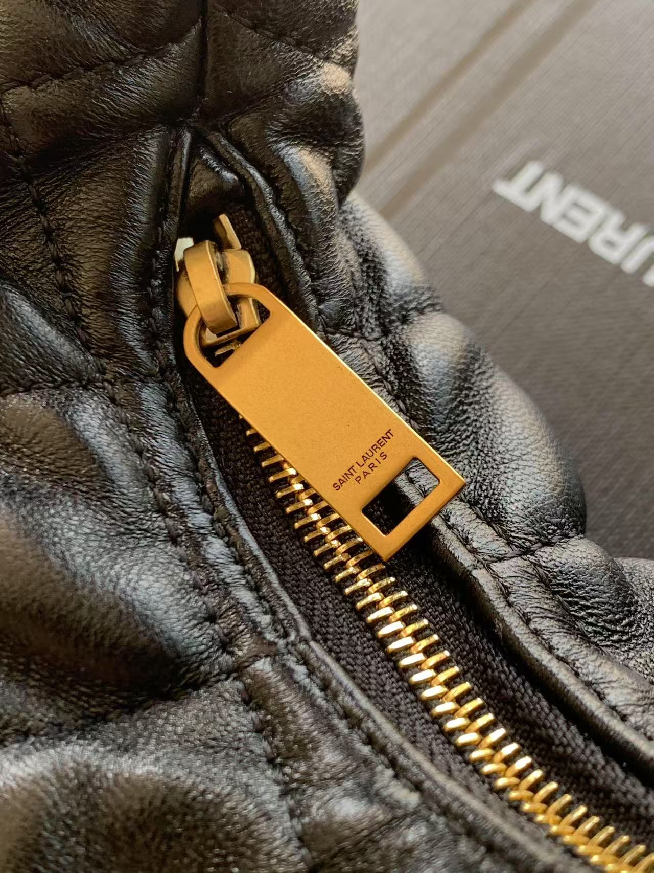 • It features the iconic gold-tone YSL logo plaque on the front, paired with a full-zip closure engraved with “SAINT LAURENT PARIS” for a refined, branded detail.