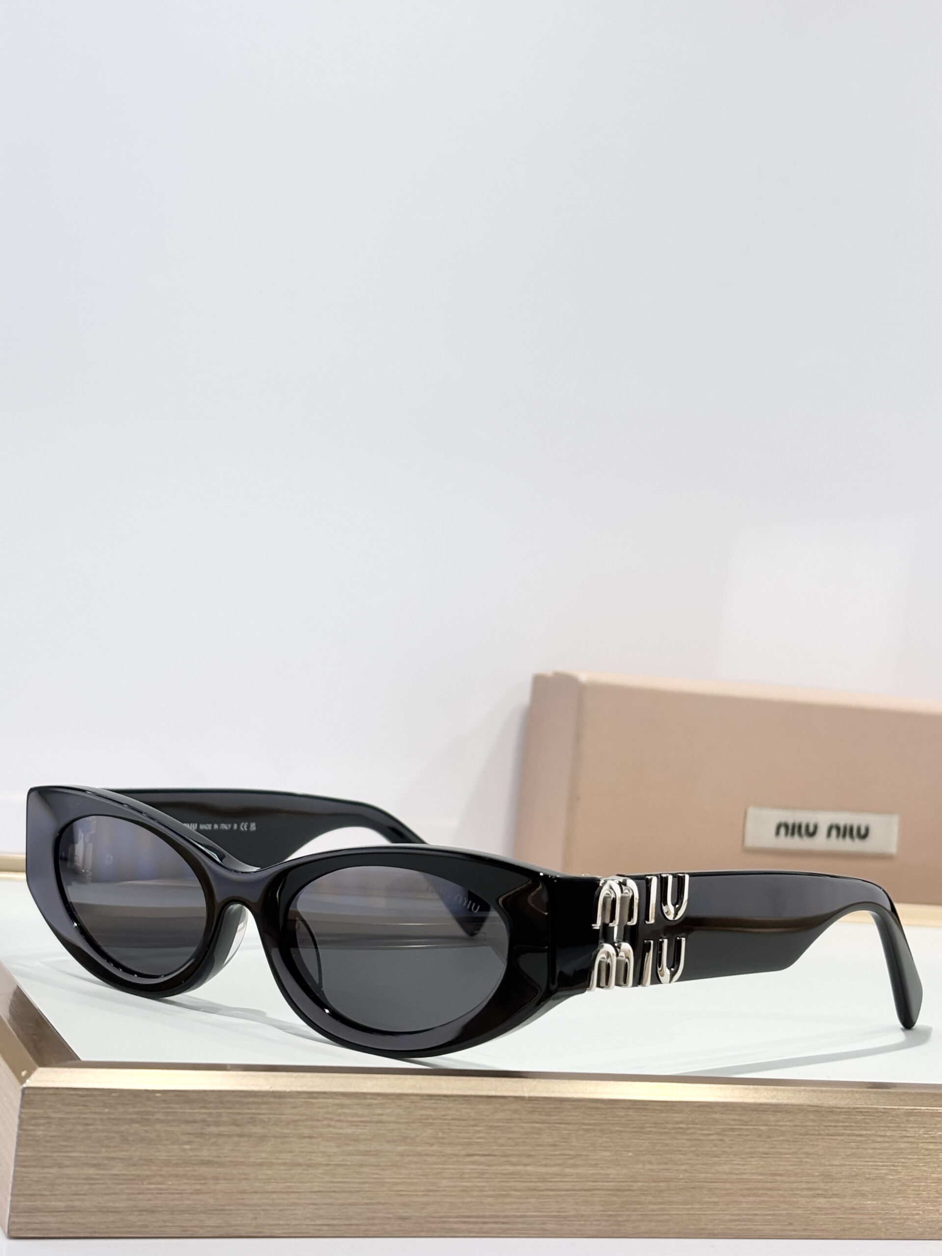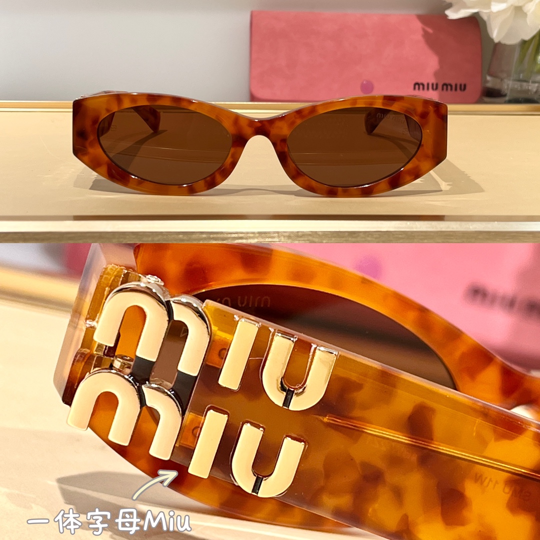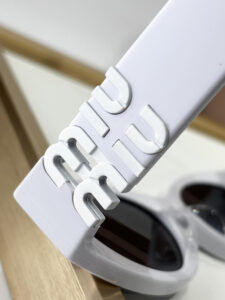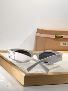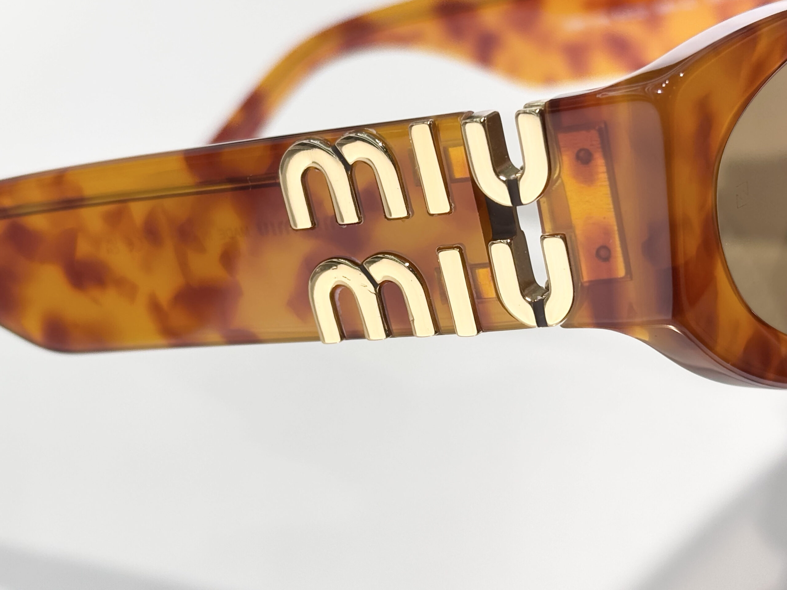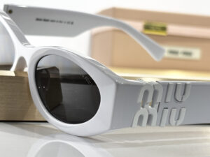 Frame Design: The bold, chunky acetate frames feature a sleek, oval silhouette that nods to early 2000s fashion. The defining detail is the double-layered 3D “MIU MIU” logo hardware on the temples—available in polished gold-tone metal for glossy finishes, and in matching matte or glossy plastic for monochromatic styles—creating an instantly recognizable statement.
