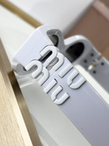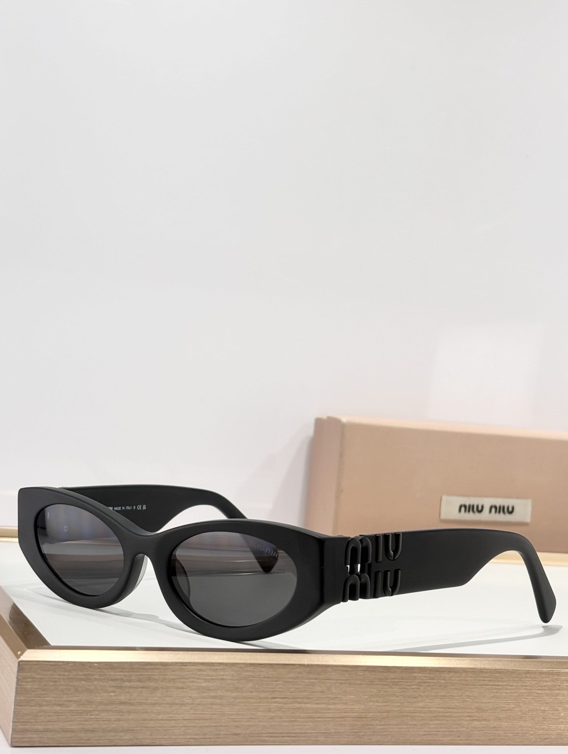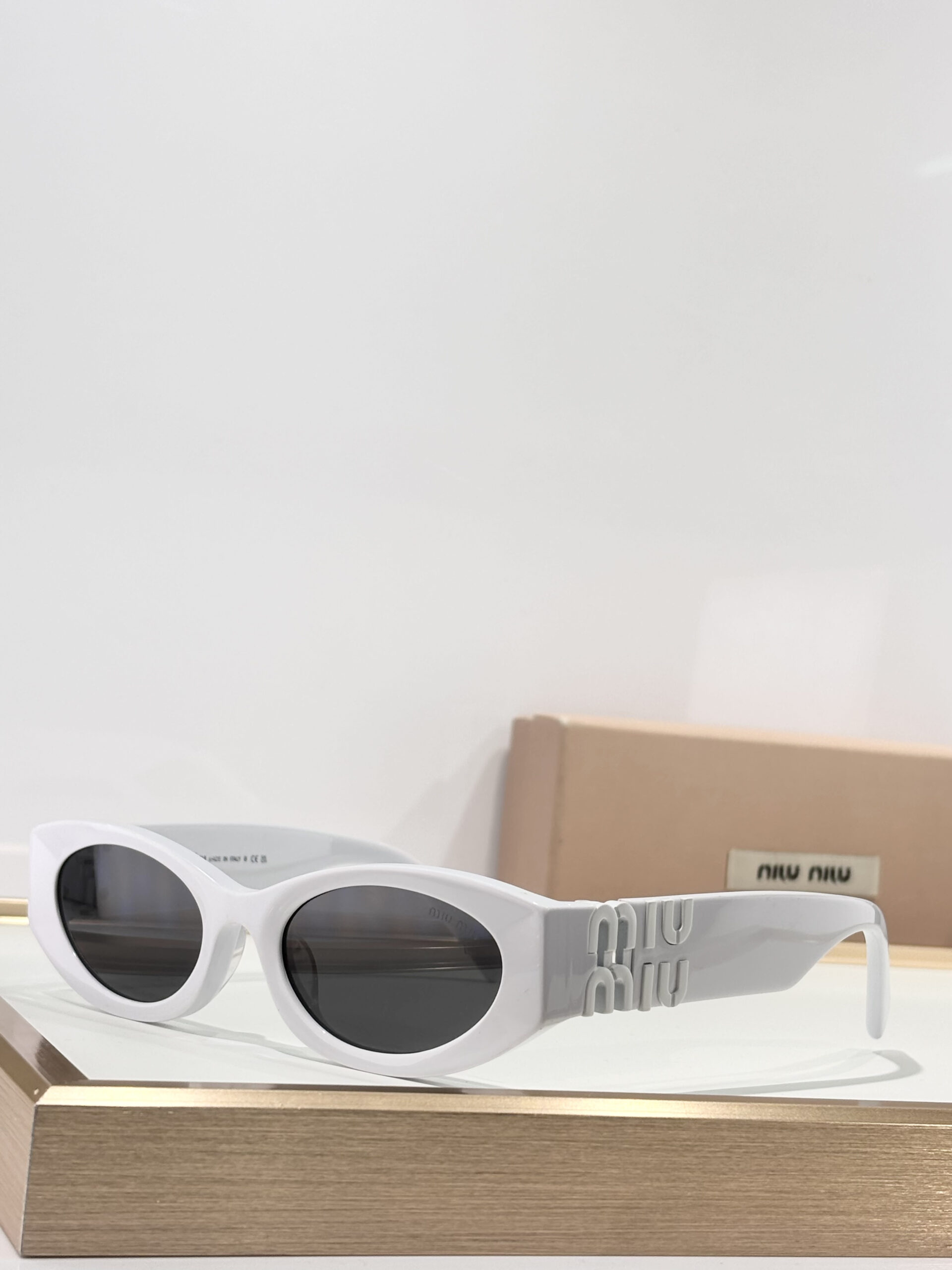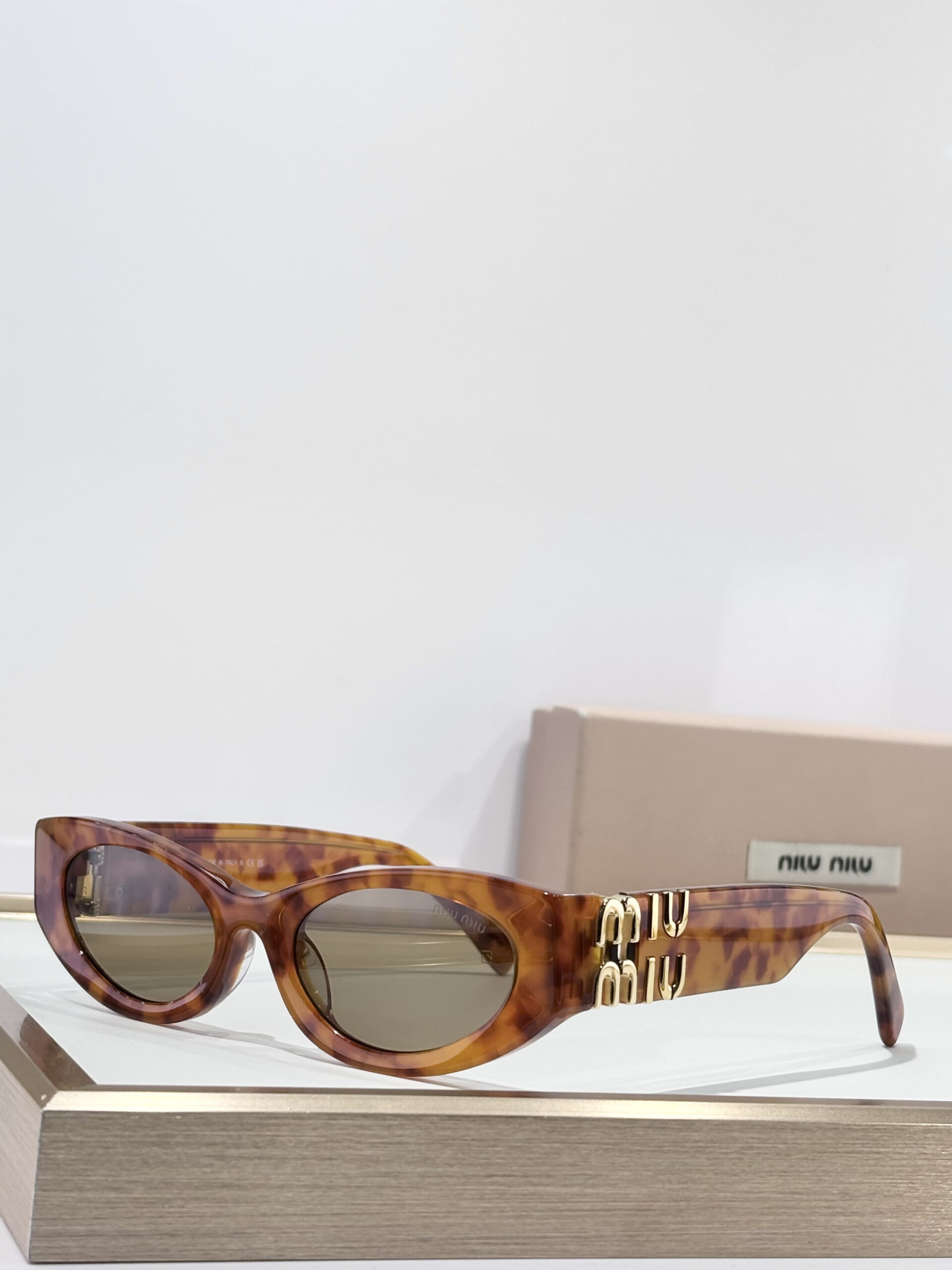 Frame Design: The bold, chunky acetate frames feature a sleek, oval silhouette that nods to early 2000s fashion. The defining detail is the double-layered 3D “MIU MIU” logo hardware on the temples—available in polished gold-tone metal for glossy finishes, and in matching matte or glossy plastic for monochromatic styles—creating an instantly recognizable statement.