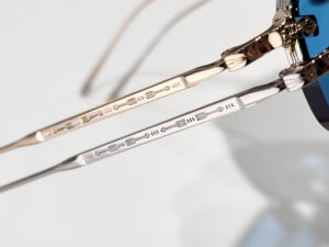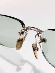 The temples are adorned with intricate, engraved patterns, and the adjustable nose pads feature subtle textural details, reflecting the brand’s commitment to luxury and comfort.