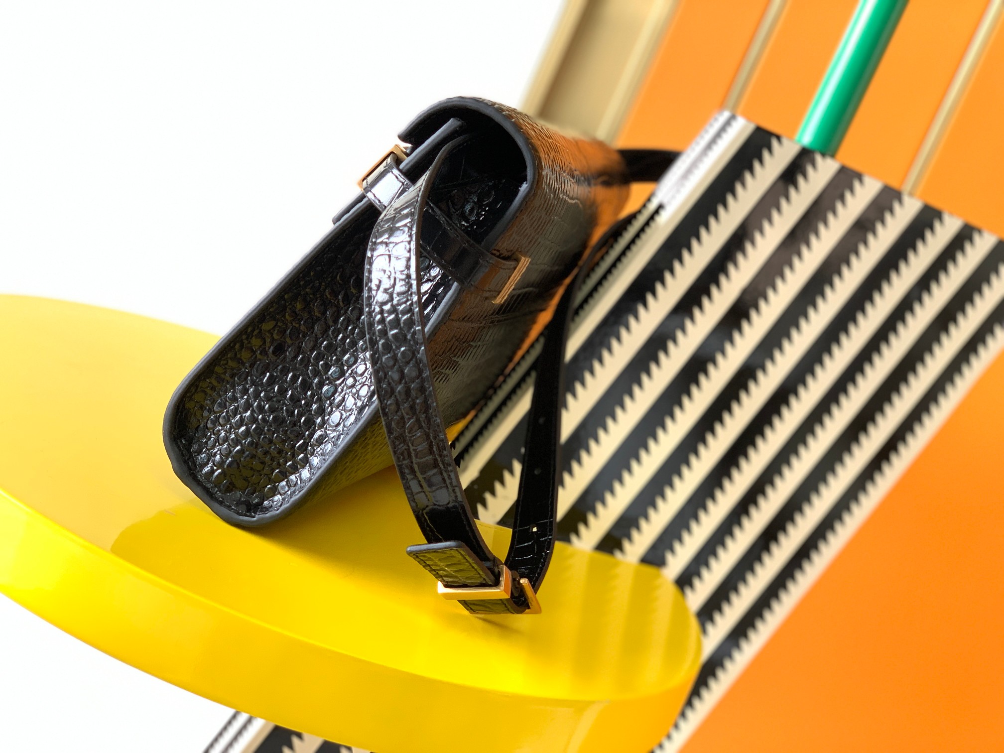 The adjustable leather shoulder strap, finished with matching crocodile embossing and gold-tone hardware, allows for comfortable shoulder or crossbody wear.