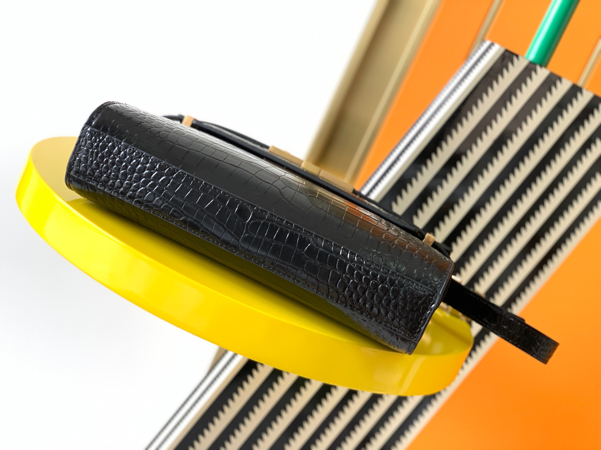 This is the Saint Laurent Manhattan Medium shoulder bag, crafted from glossy black crocodile-embossed leather that delivers a bold, luxurious texture with a subtle sheen.