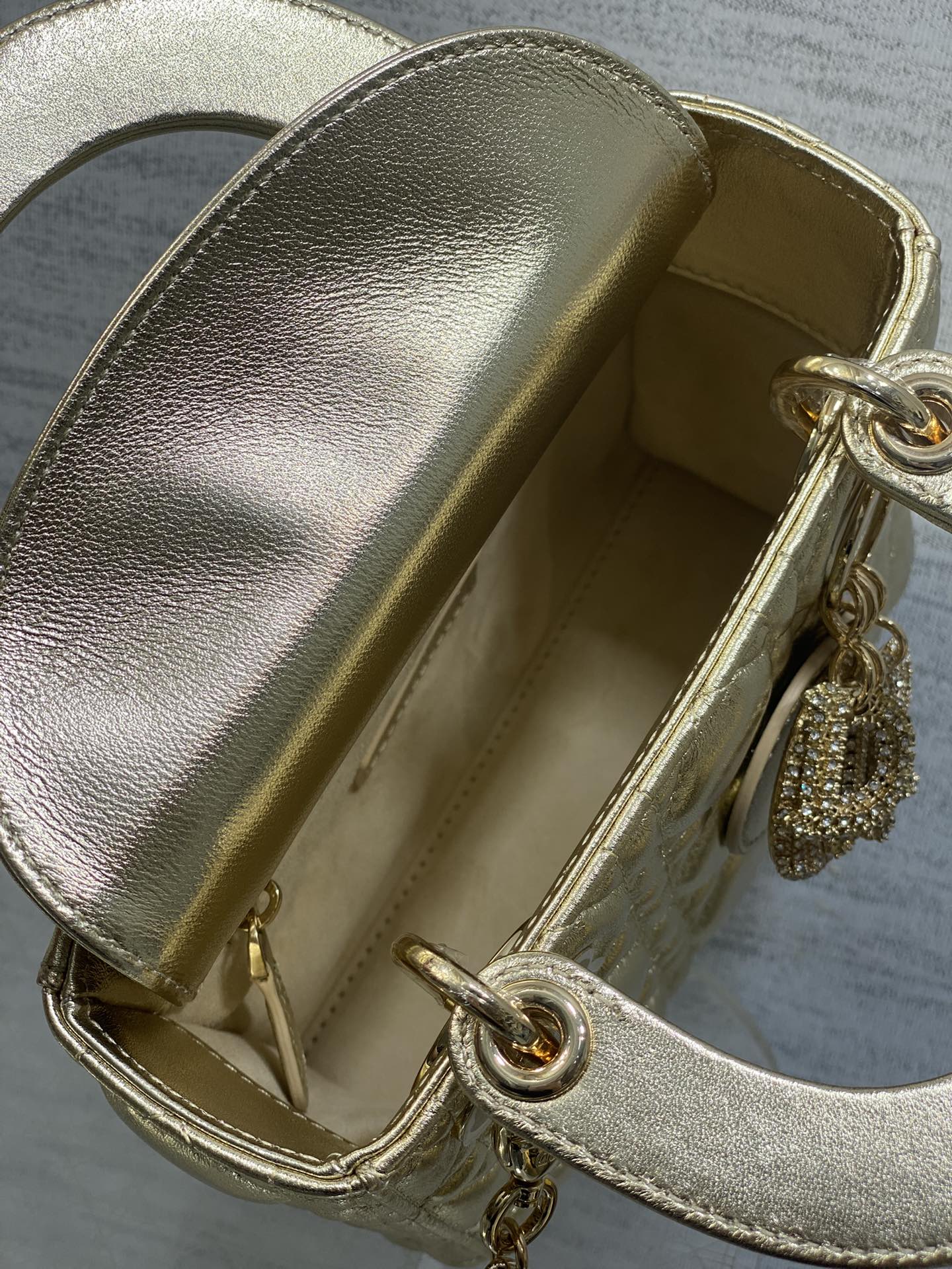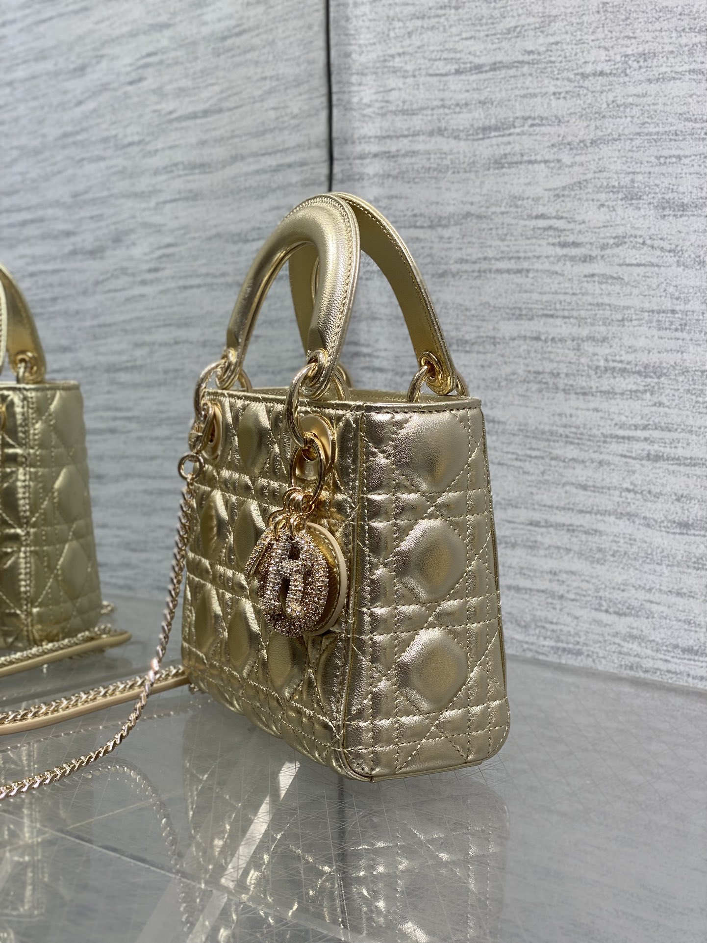 This is a Christian Dior handbag crafted from lustrous metallic gold leather, featuring the brand’s signature diamond-quilted pattern for texture and dimension.