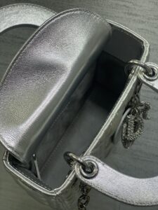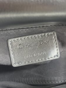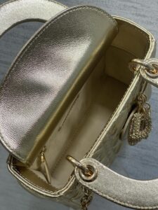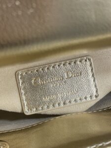 The interior is lined in soft gold fabric, with a slip pocket for small essentials, and includes a “Christian Dior PARIS MADE IN ITALY” label for authenticity.