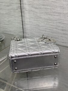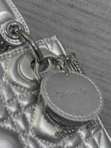 It is elevated by eye-catching details: polished gold-tone hardware (including circular ring attachments and protective base feet) and a sparkling crystal-embellished “DIOR” logo charm (a standout focal point).