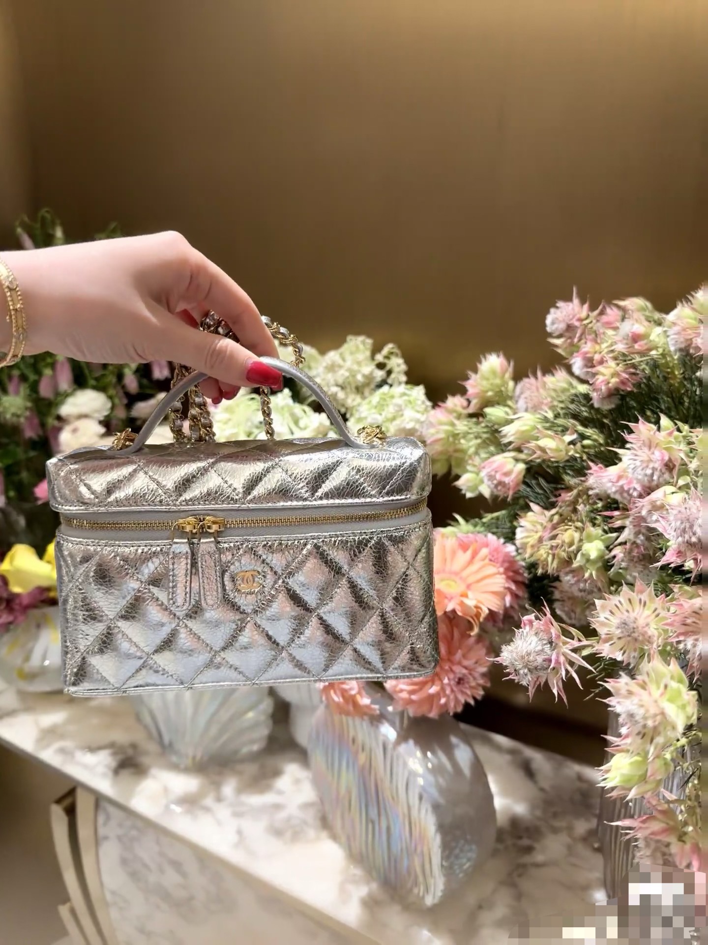 This Chanel vanity-style bag is a showstopping statement piece, crafted from exclusive silver crinkled metallic leather—a rare finish that catches light with every movement (unlike flat metallic alternatives, its textured surface adds depth and luxury).