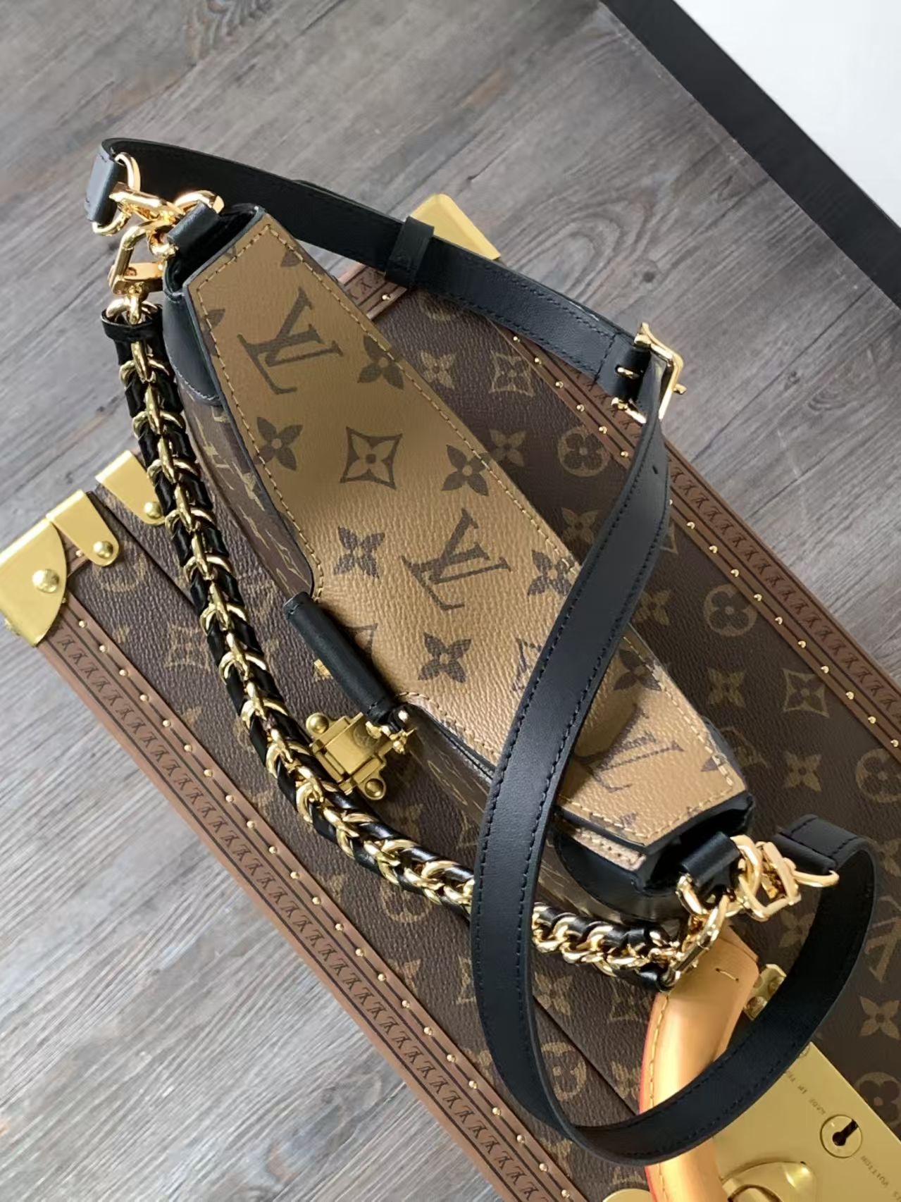 • It is accented with black leather details and gold-tone hardware, including a distinctive turn-lock closure and a chain strap interwoven with black leather for a luxurious touch.
