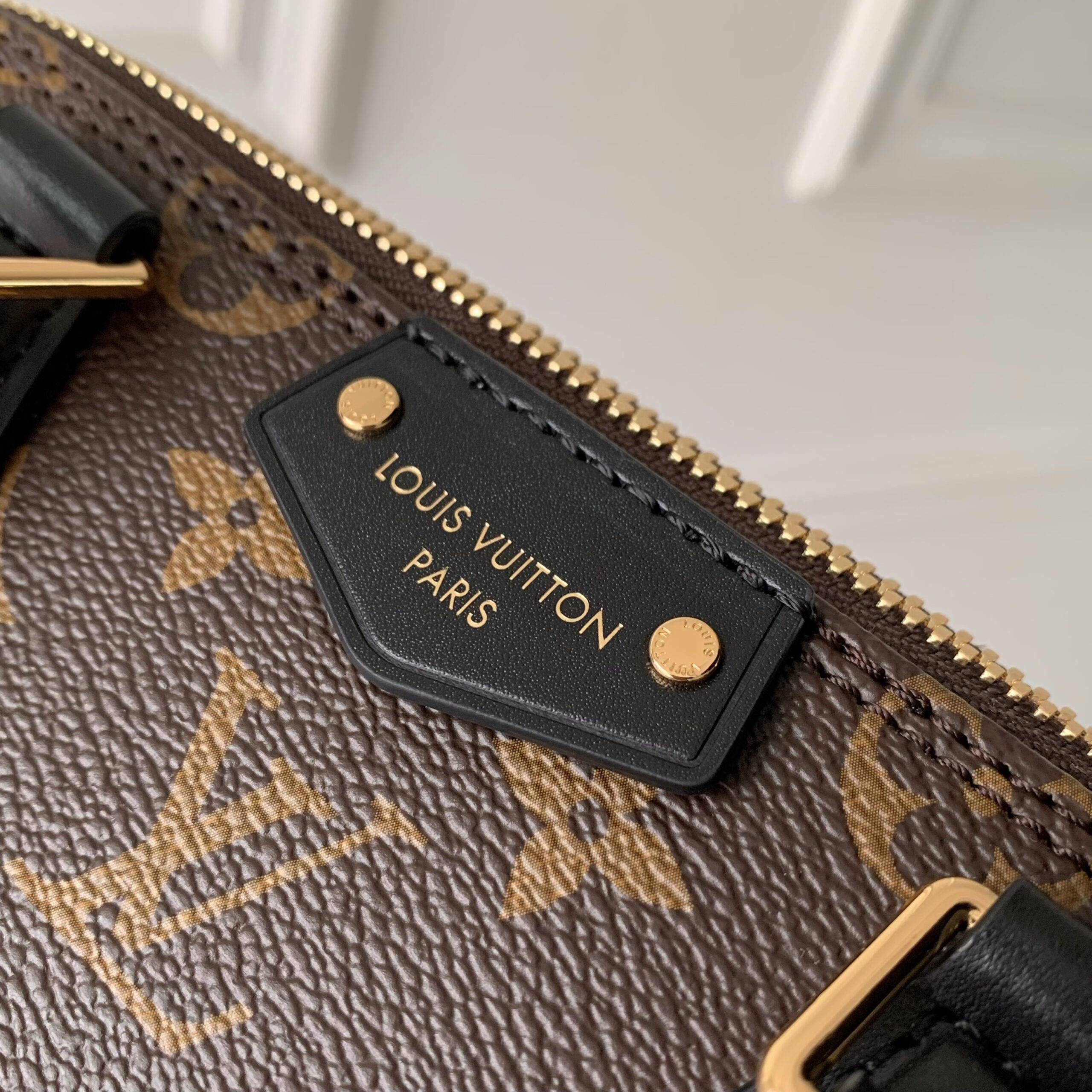 A black leather “LOUIS VUITTON PARIS” label (fastened with gold-tone studs) adds a refined brand detail.