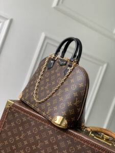 The bag has a structured, rounded silhouette (similar to the brand’s Alma style), equipped with dual top leather handles (for hand carry) and a full-zip closure for secure storage.