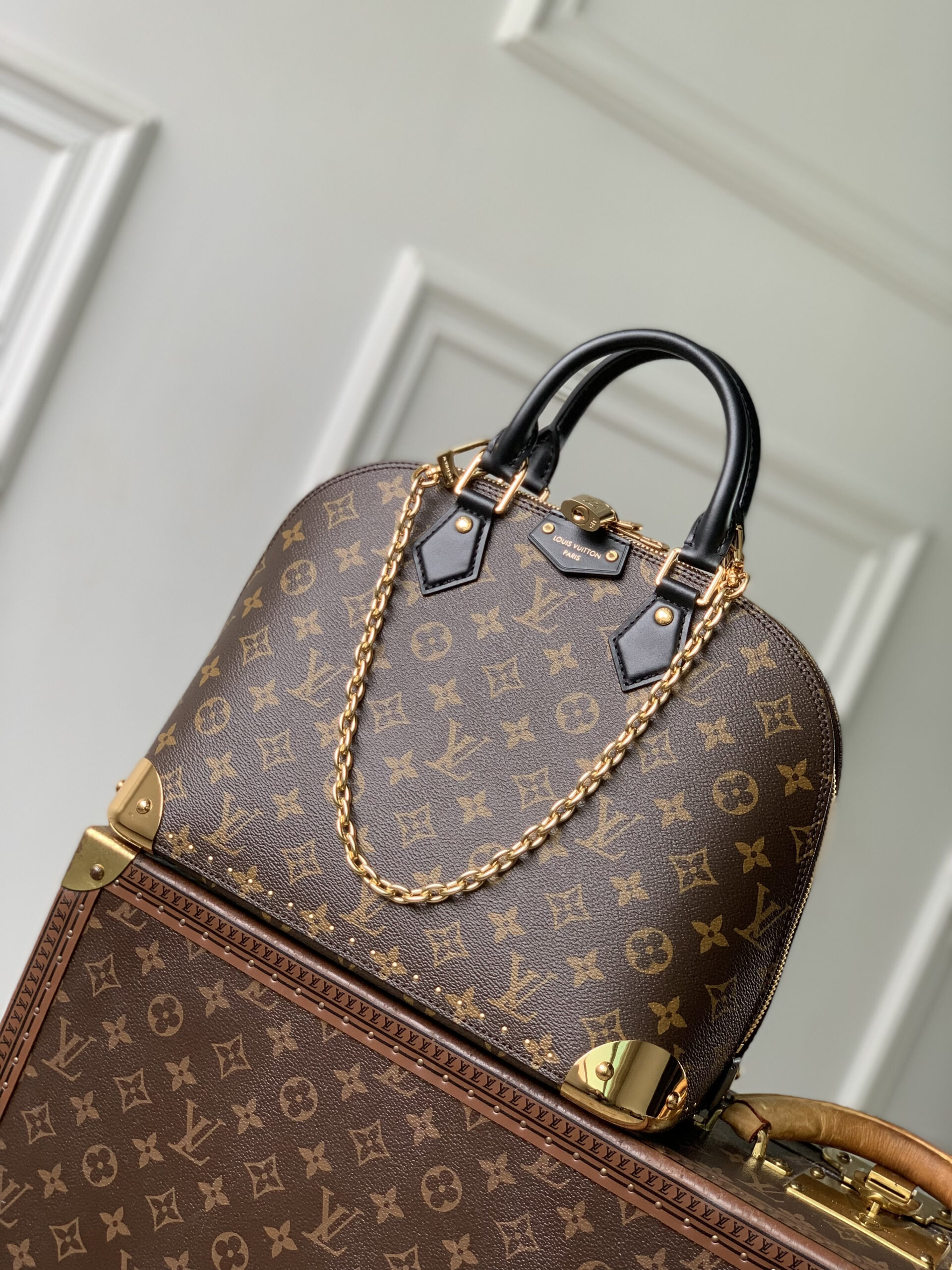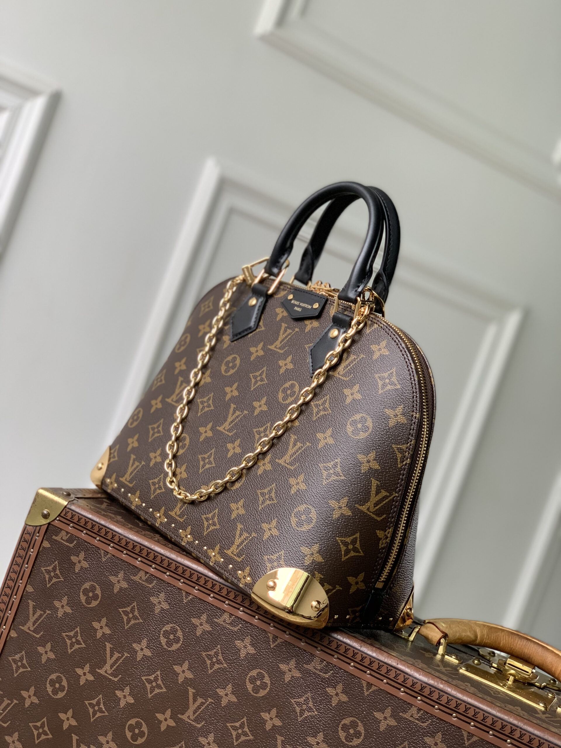 It is finished with polished gold-tone hardware, including protective corner studs, zipper details, and a detachable gold chain (for shoulder/crossbody wear).