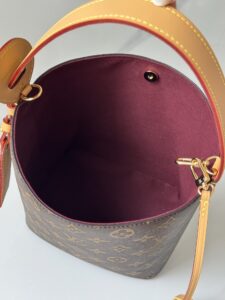 • This is a Louis Vuitton mini bucket bag crafted from the brand’s iconic brown Monogram canvas (featuring classic LV initials and floral motifs).