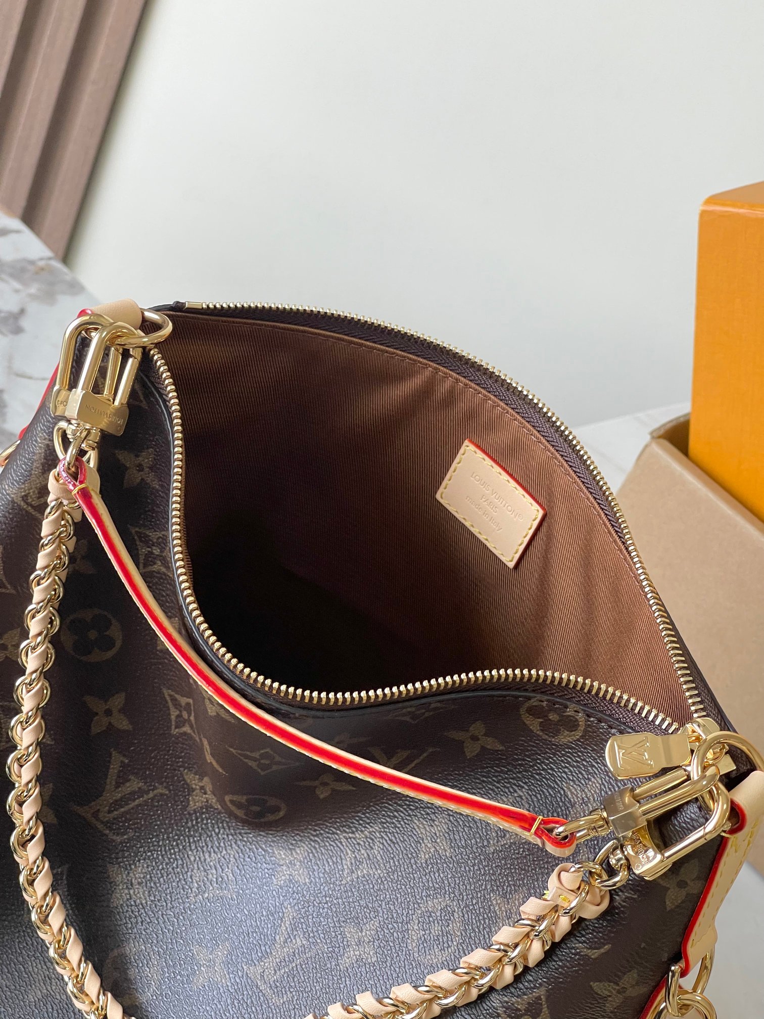 • Distinctive design details: Contrasting red leather accents (adding a bold pop of color) + gold-tone hardware engraved with “LOUIS VUITTON” (marking authentic, premium craftsmanship)