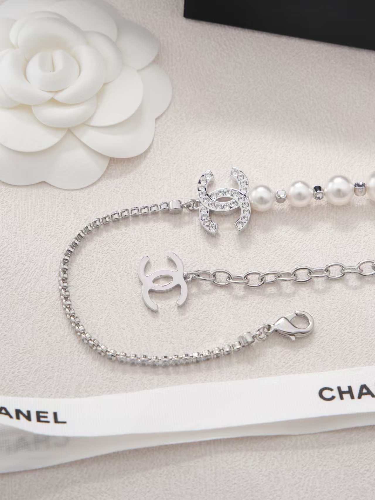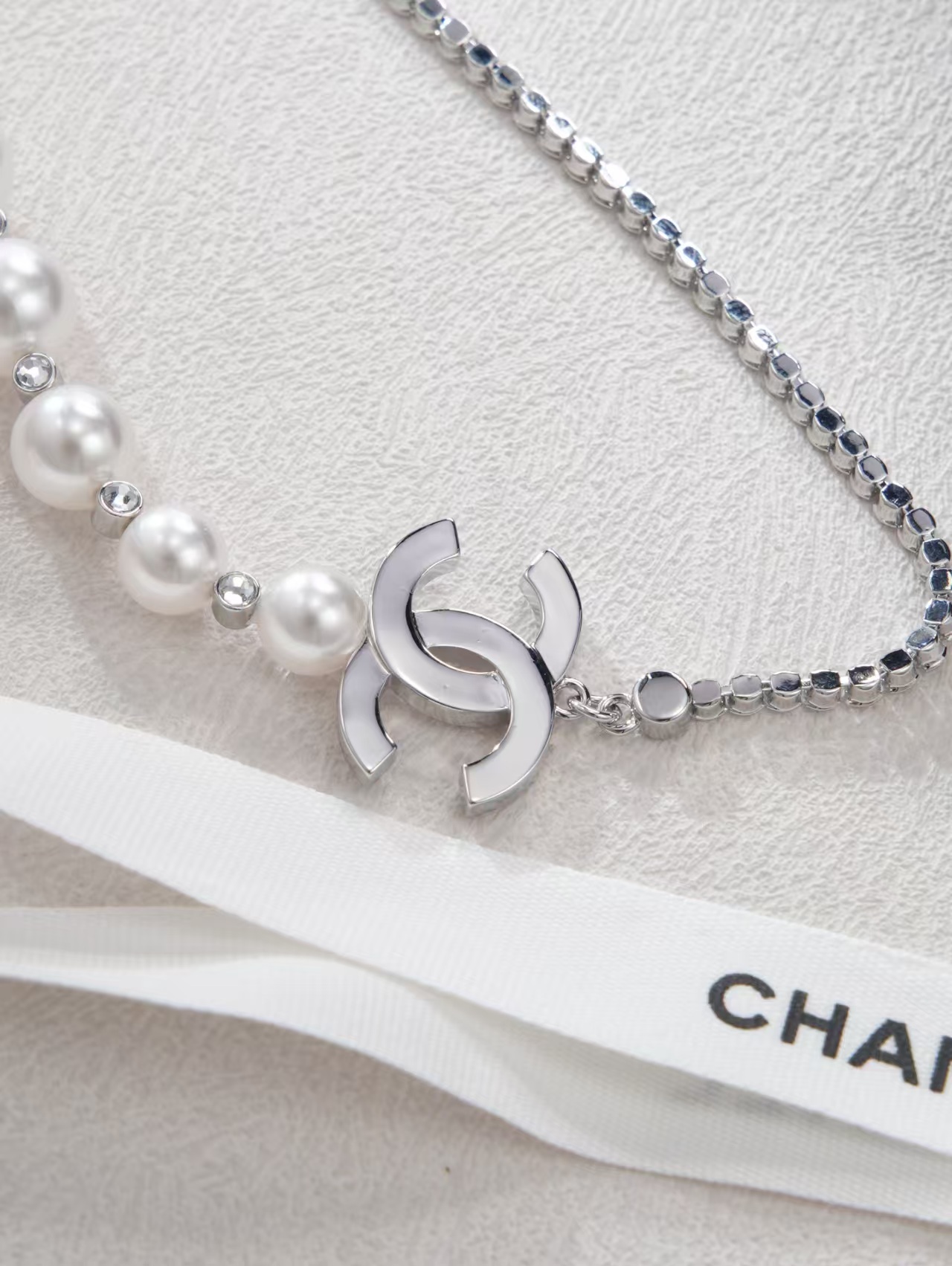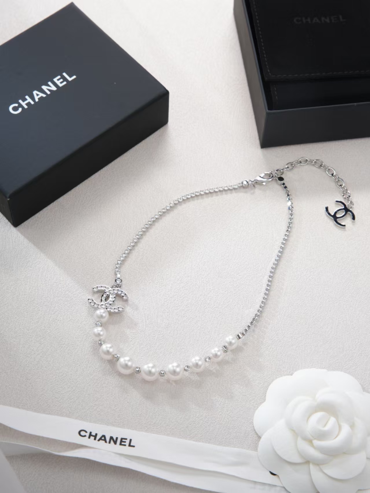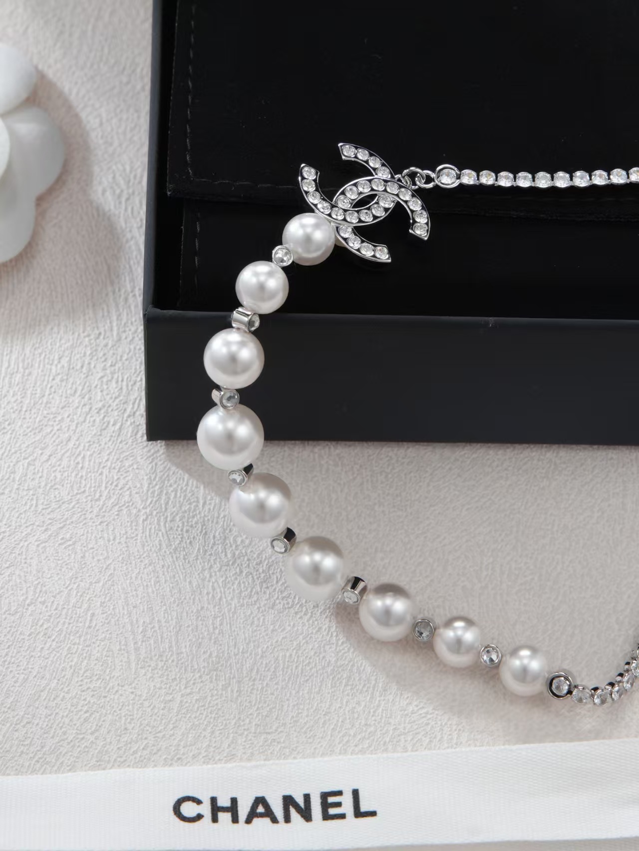 The product in the pictures is an elegant necklace from Chanel. It features a design that combines a strand of lustrous white pearls with sparkling crystals.