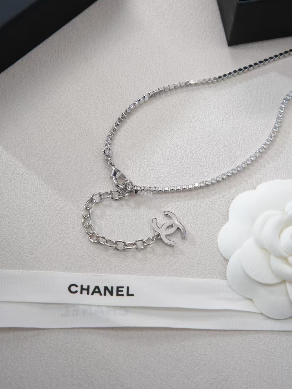 At the center, there is the iconic interlocking “CC” logo encrusted with crystals. The necklace has a silver – toned chain with an adjustable clasp, and a small “CC” logo charm hangs from the extension chain.