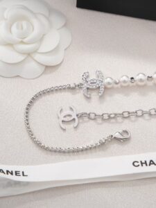 This piece blends timeless pearl elegance with Chanel’s distinctive branding and crystal detailing, making it a sophisticated accessory suitable for elevating both formal and casual looks.