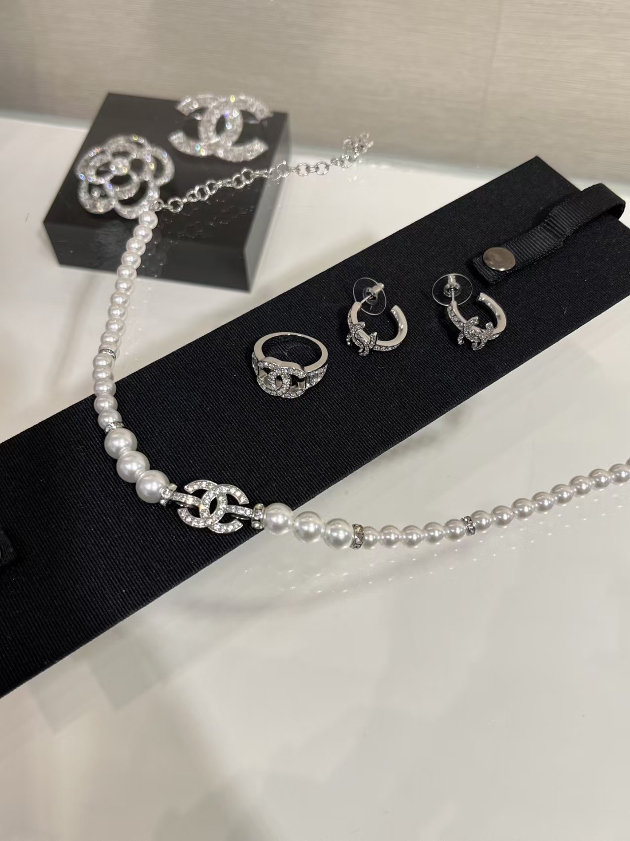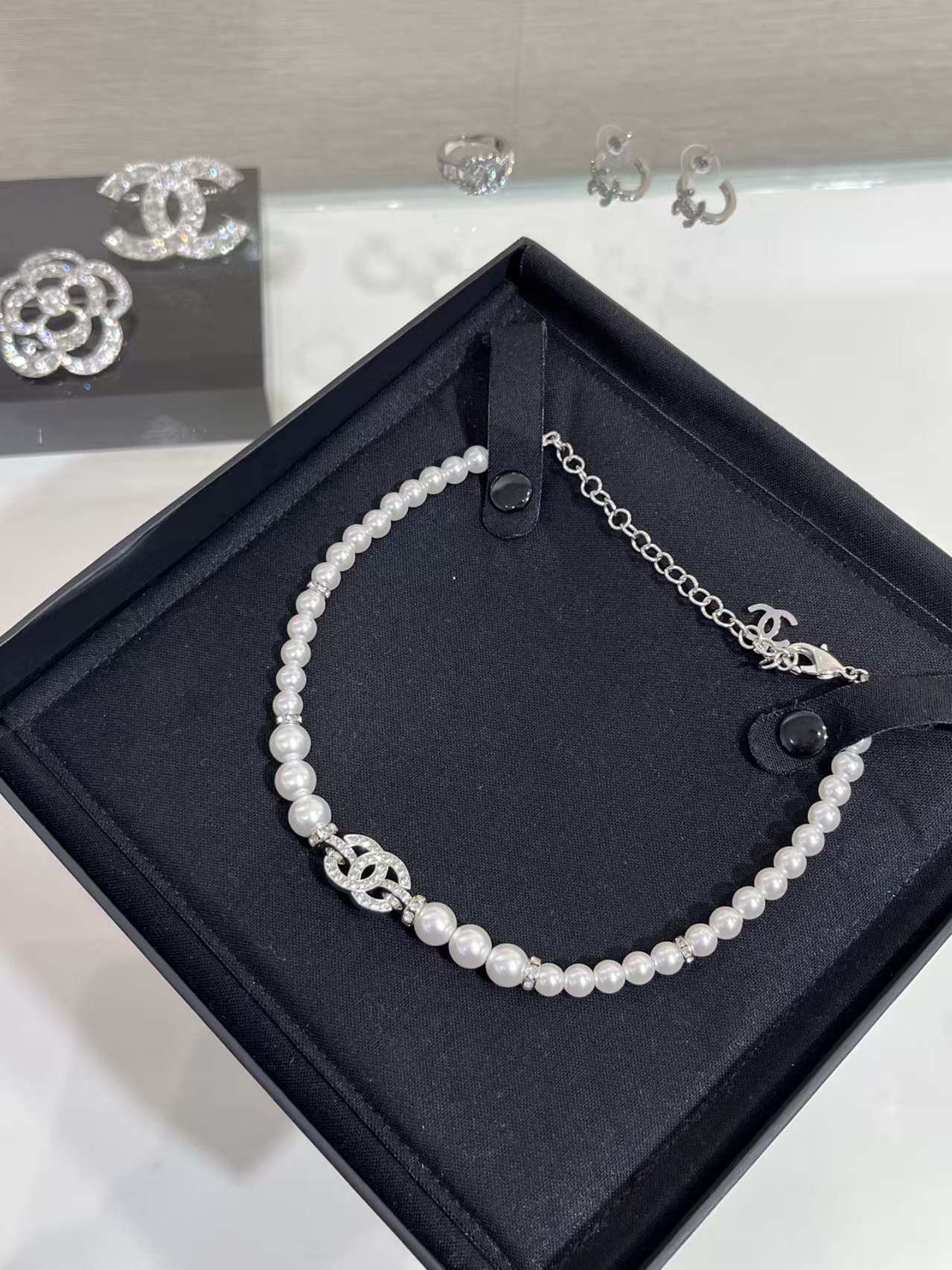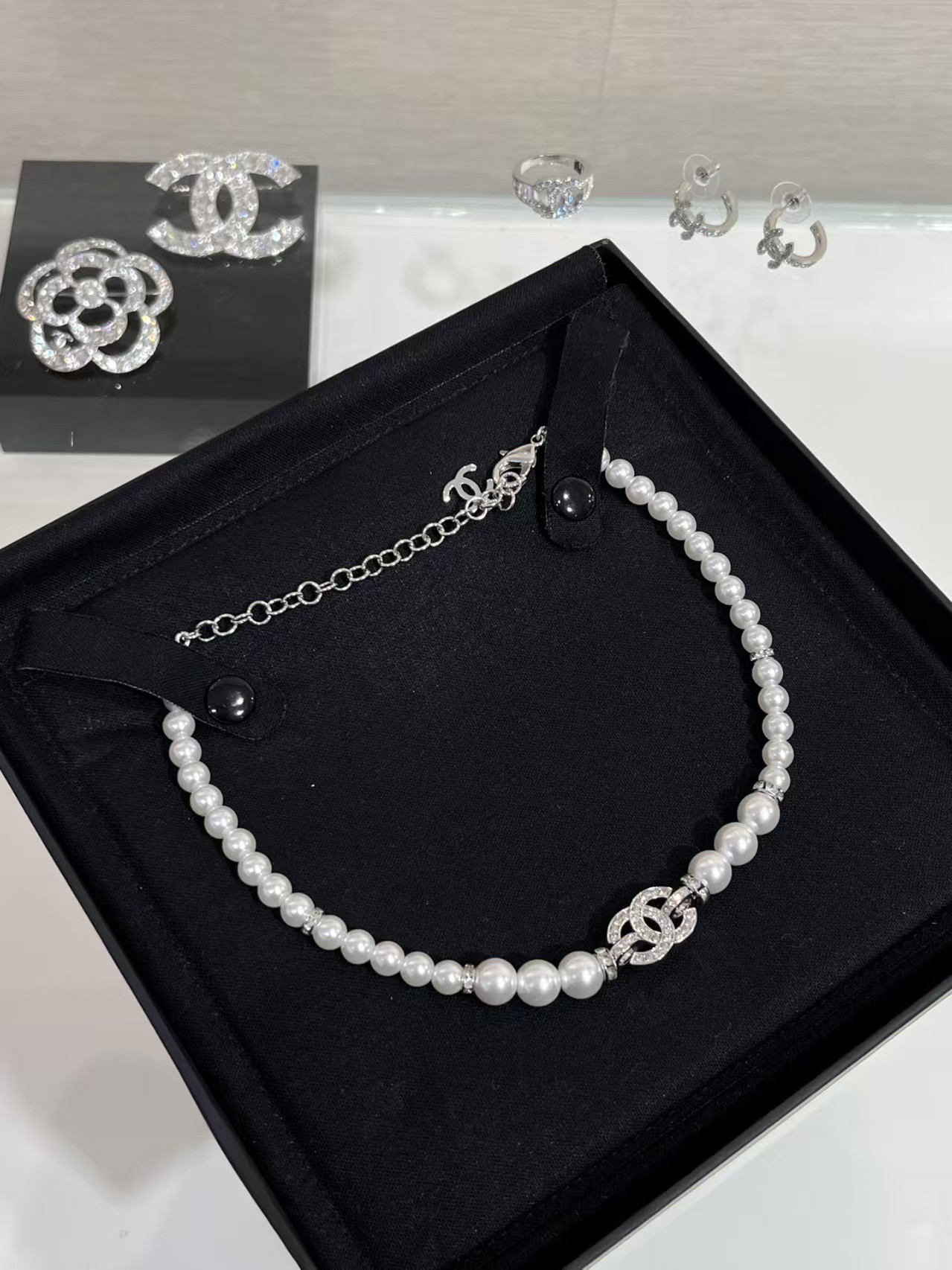 It is presented in a classic black Chanel jewelry box, and the collection includes matching pieces like earrings and a ring, all showcasing the same crystal – encrusted “CC” design.