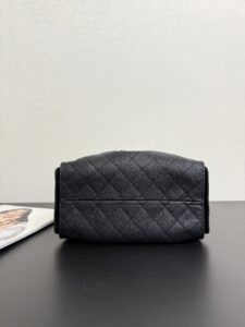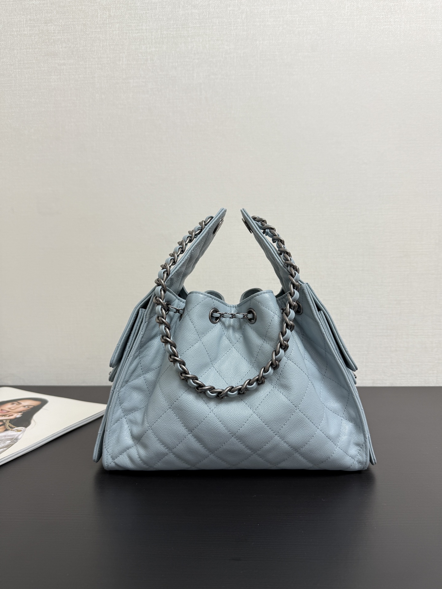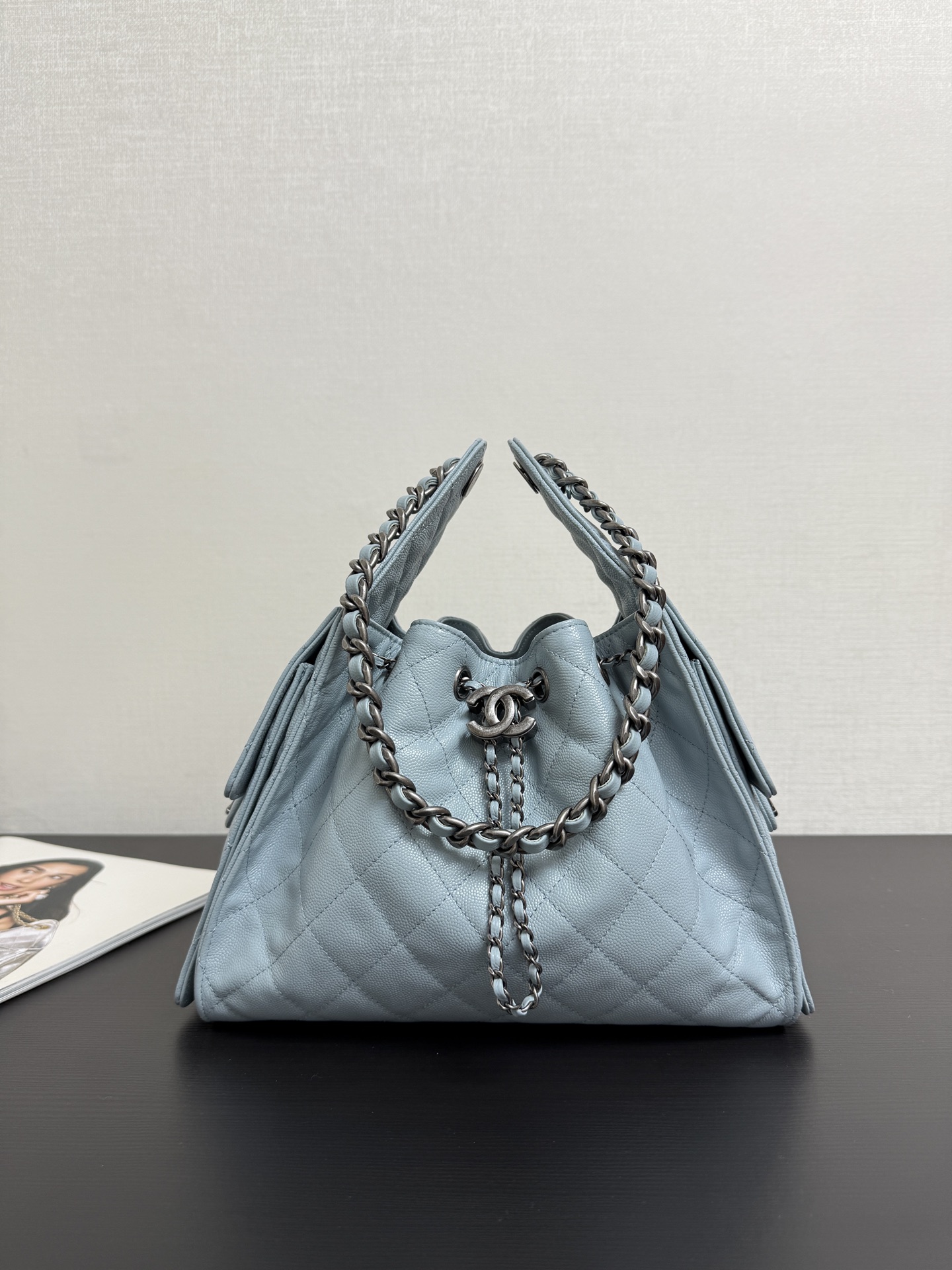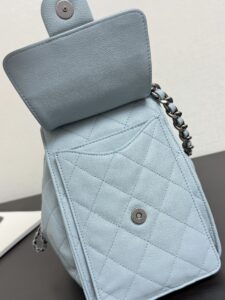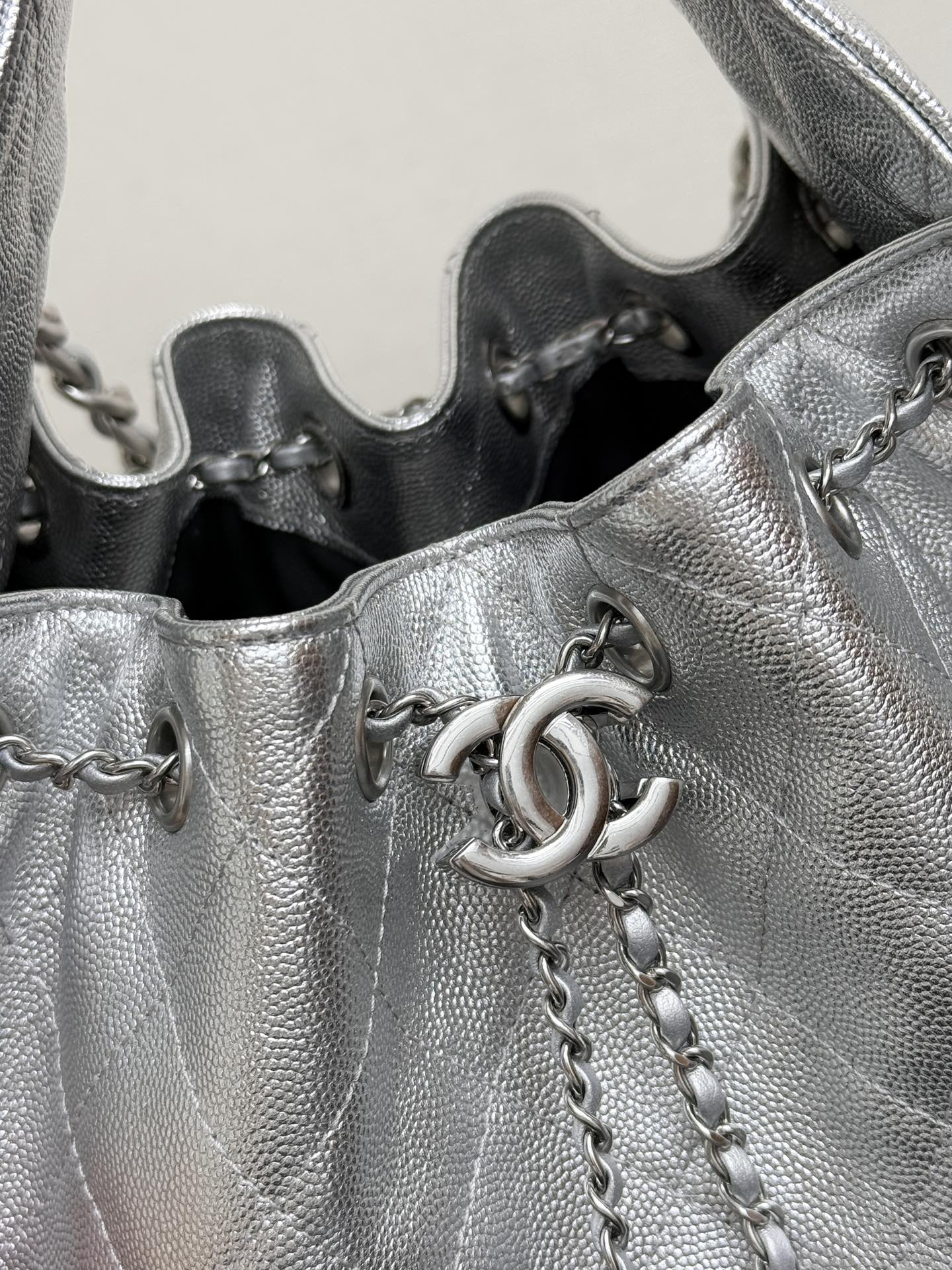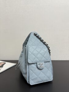 Quilted Drawstring Bucket Bag – Metallic Silver/Light Blue/Black Caviar Leather