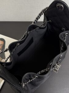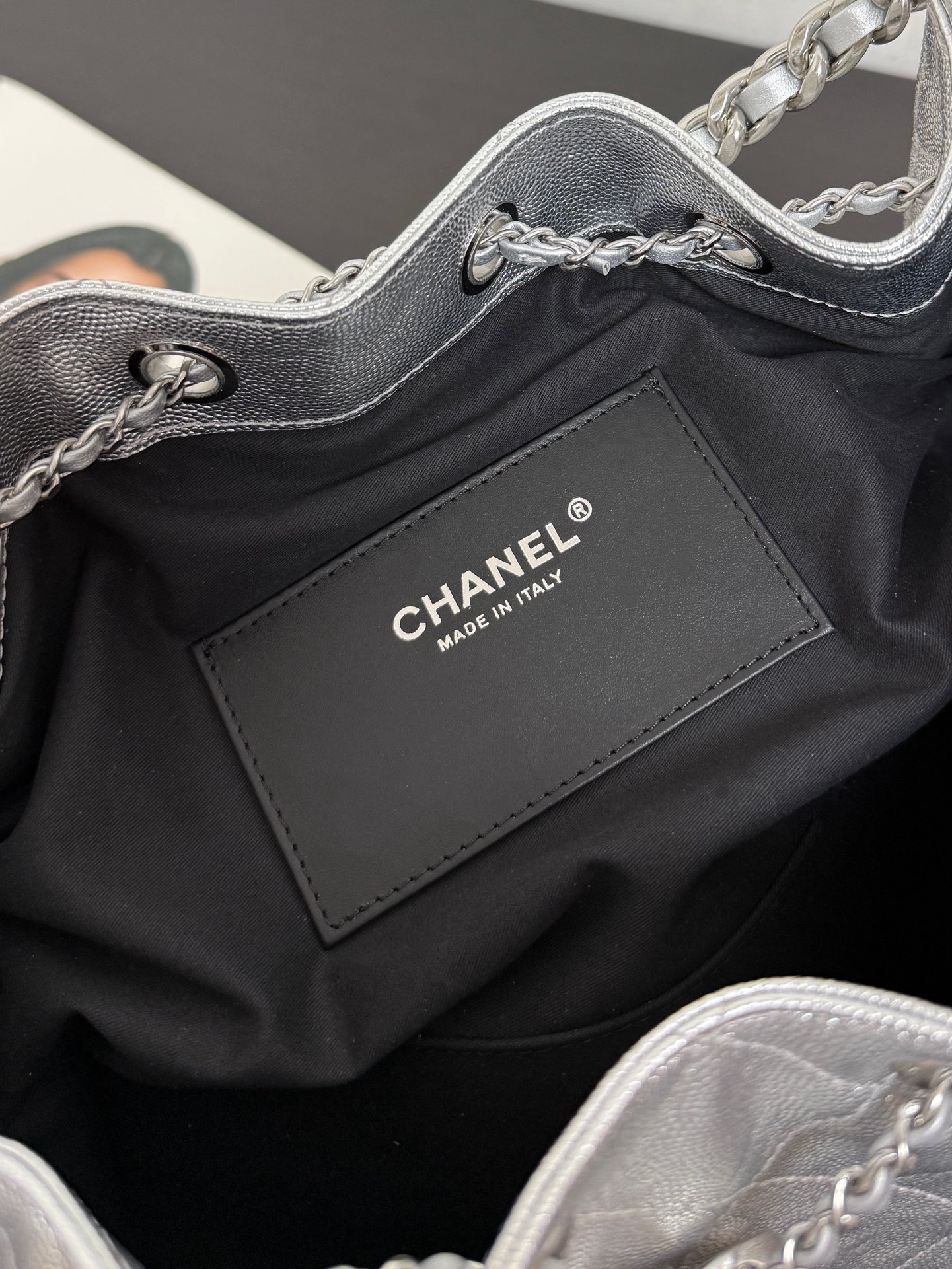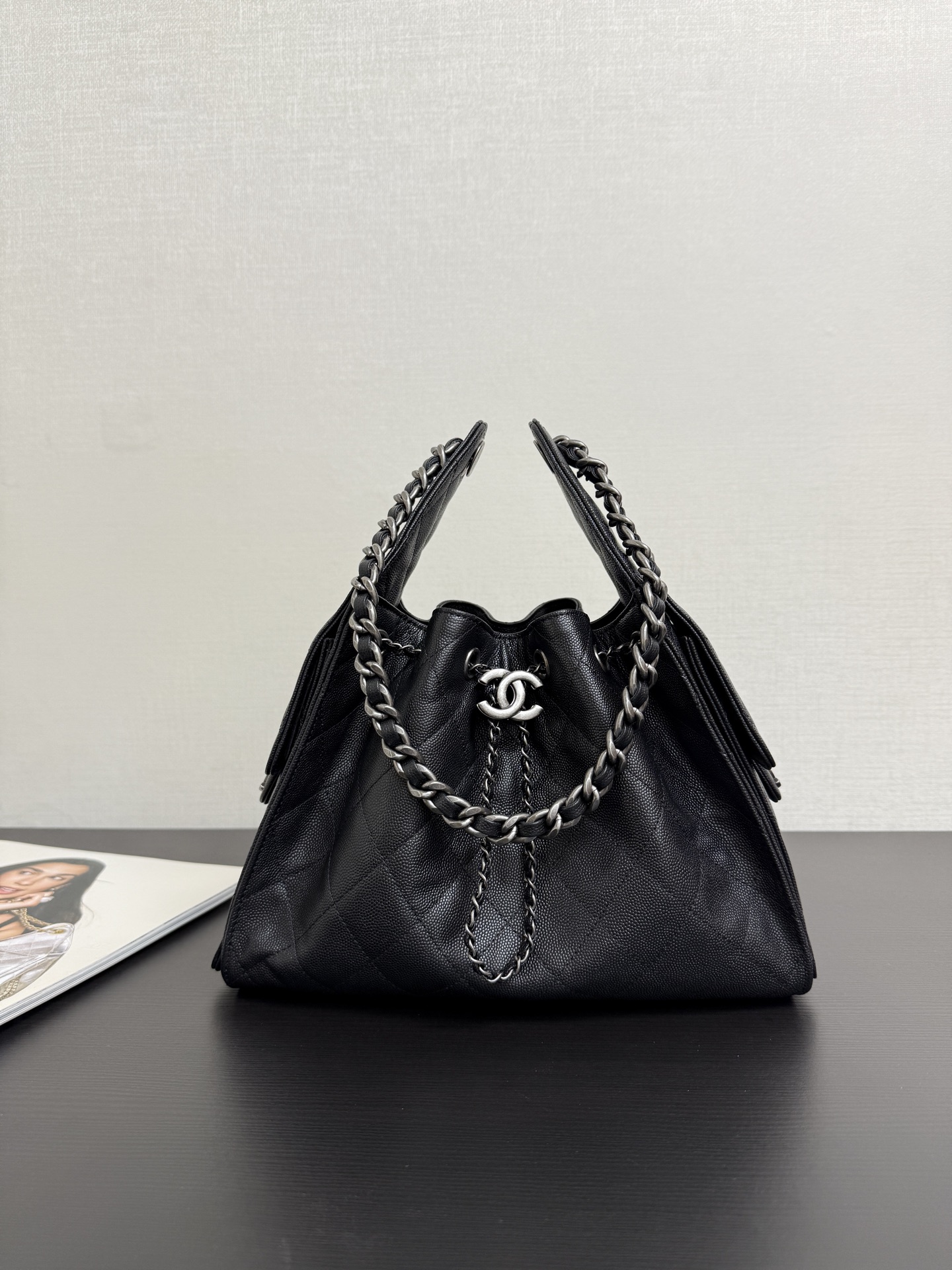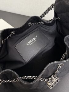 The design features sophisticated ruthenium-tone hardware (gunmetal finish), including the interlocking CC logo drawstring toggle, leather-woven chain top handles, and engraved eyelets stamped with “31 RUE CAMBON PARIS”—a nod to CHANEL’s historic Parisian address.