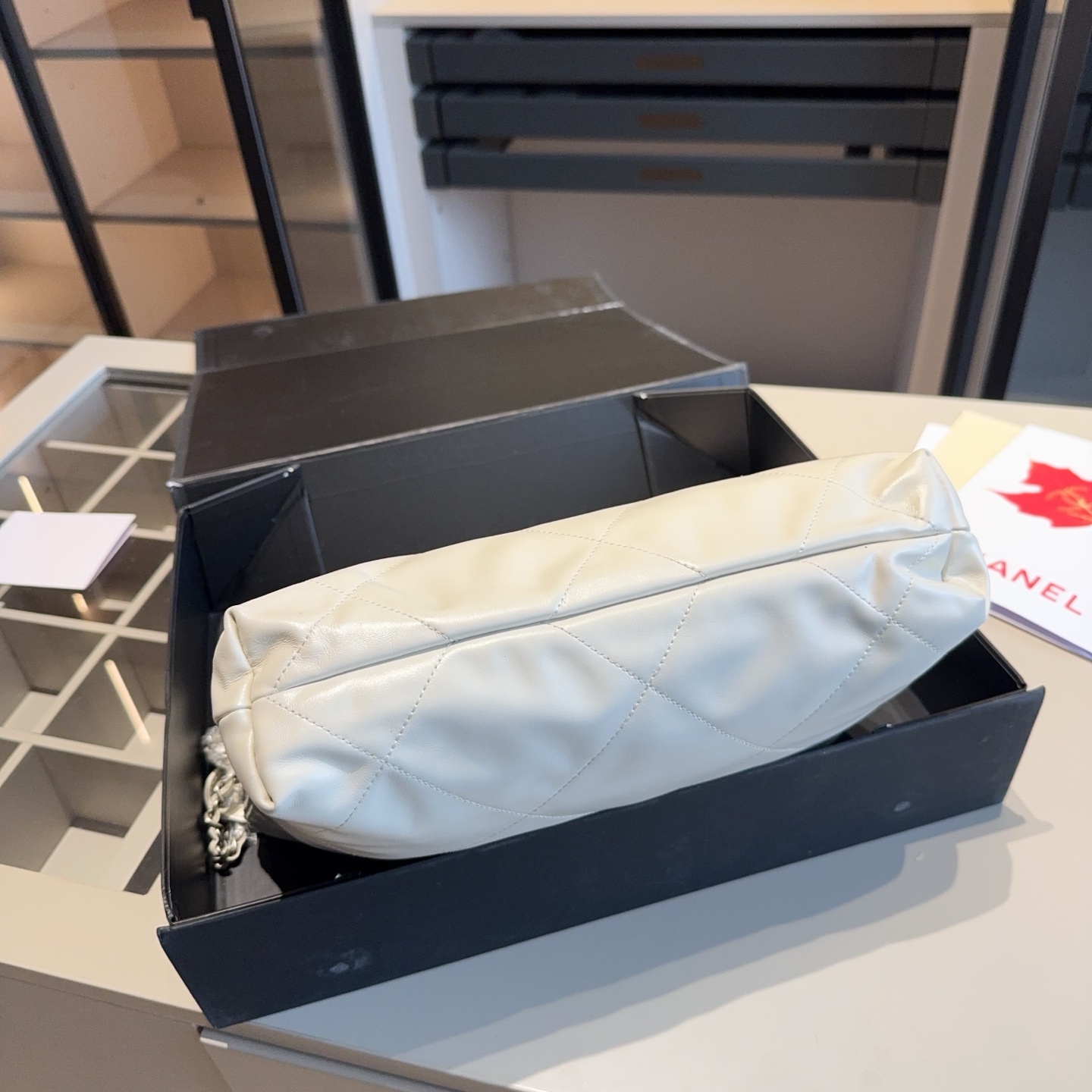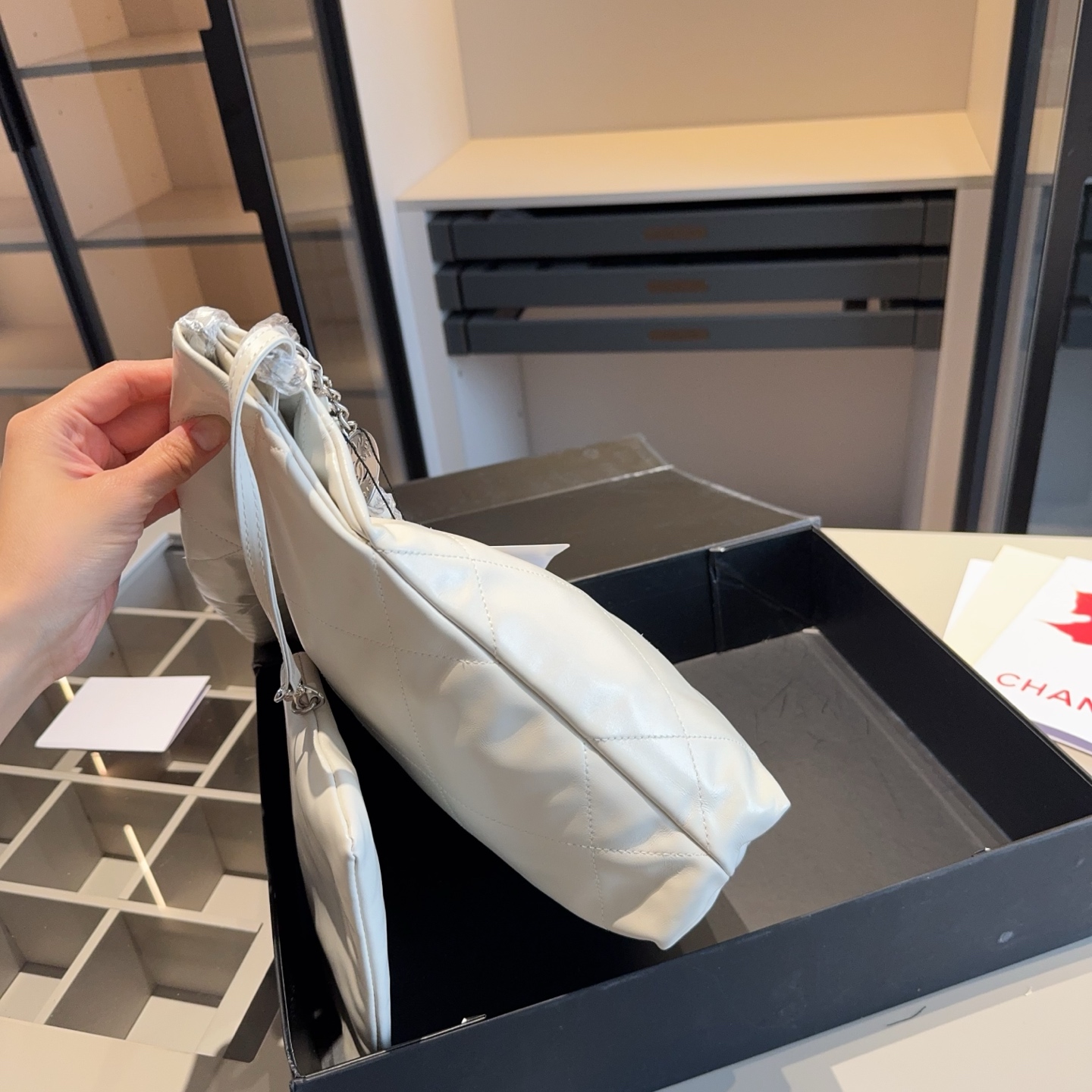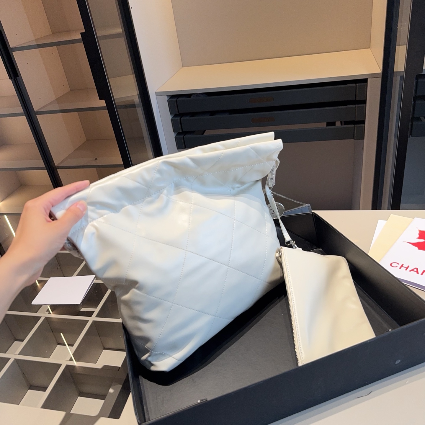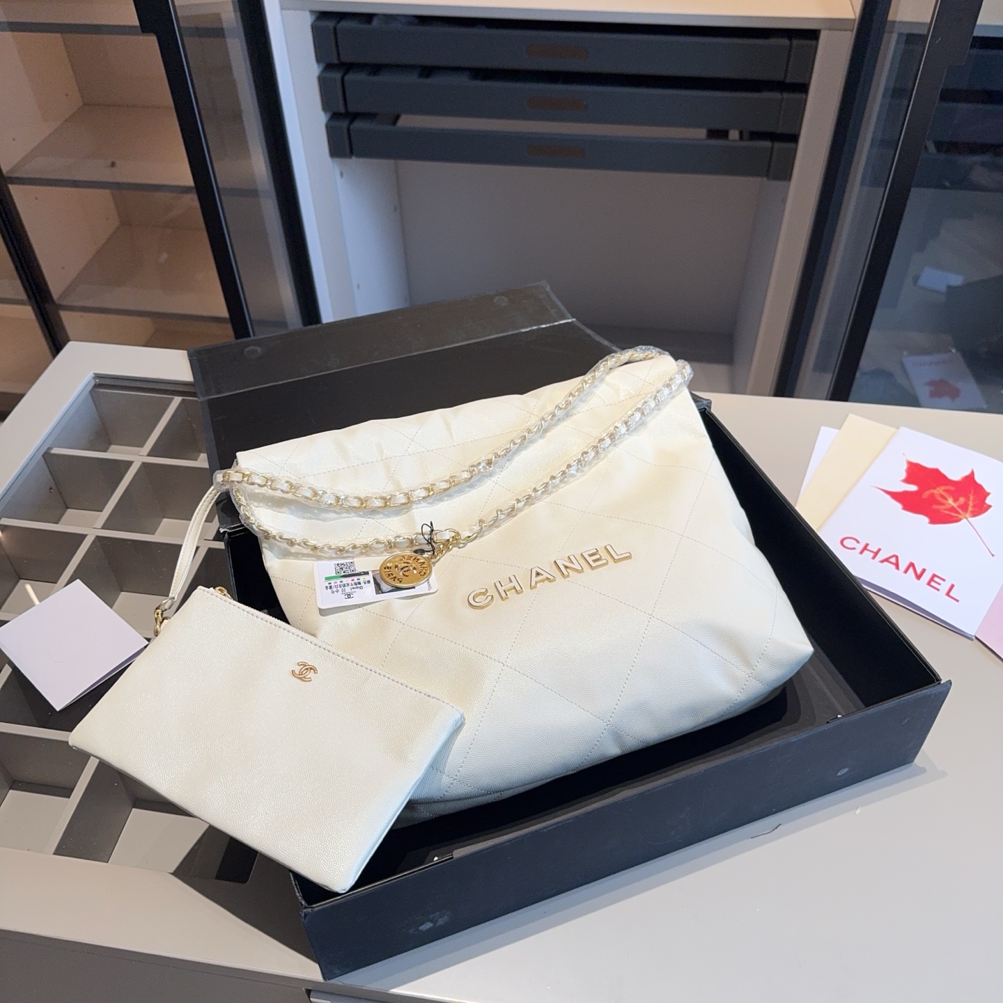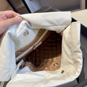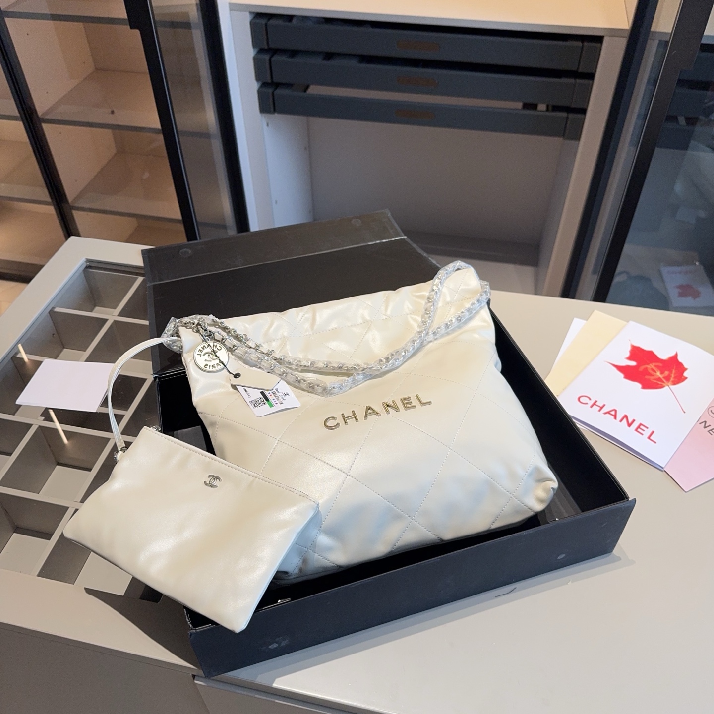 The products in the pictures are a set of bags from Chanel, including a large tote bag and a small pouch.