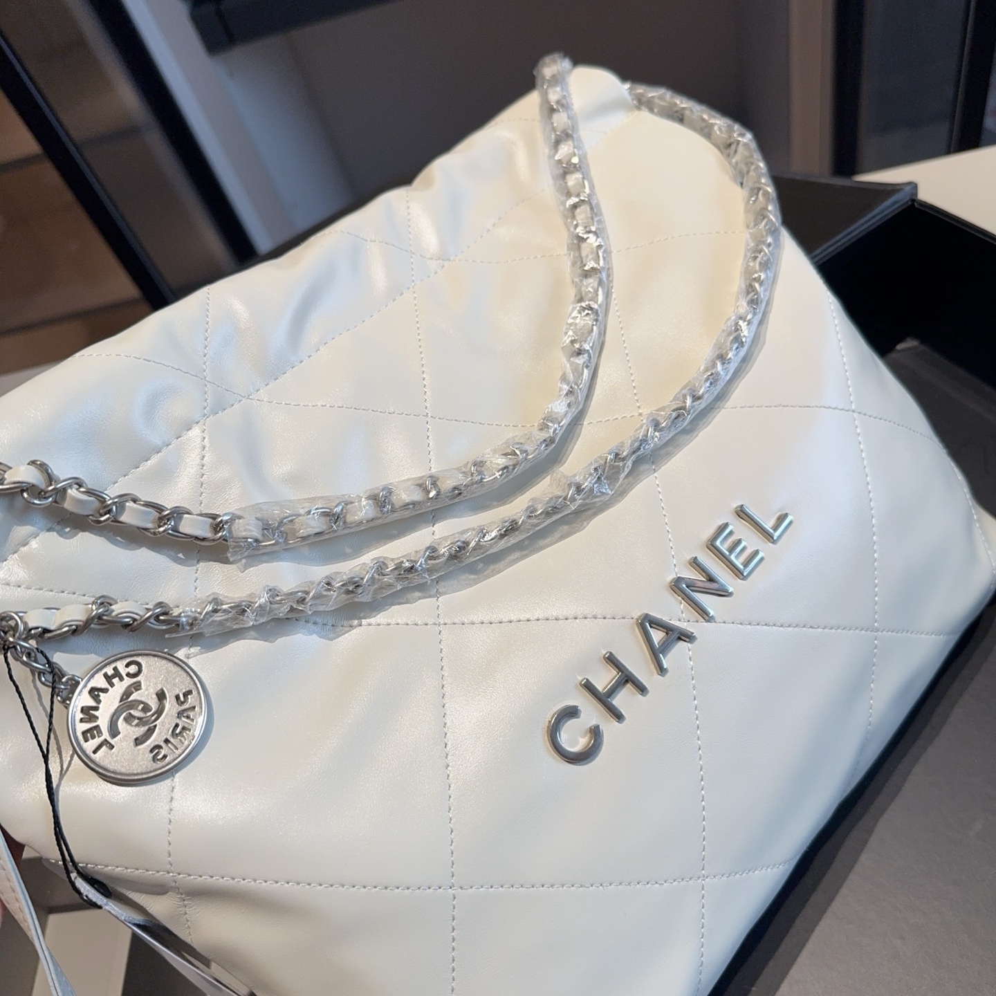 They are crafted from quilted leather, available in white and black. The tote bags feature silver chain straps, the “CHANEL” logo prominently displayed on the front, and a circular logo charm hanging from the chain.