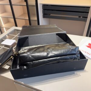 The small pouches are also made of leather, with the iconic interlocking “CC” logo. The bags have quilted interiors with zipper compartments, and they come in Chanel’s signature packaging.
