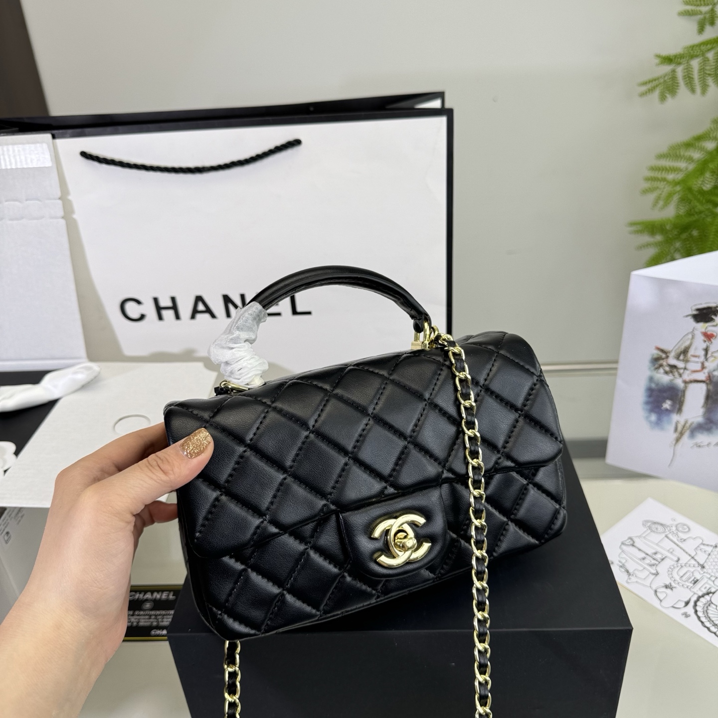 It features the brand’s signature diamond – quilted pattern on leather. The bag is equipped with a top handle and a silver chain strap, allowing for versatile carrying options.