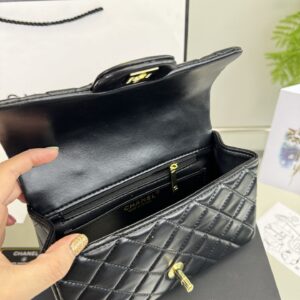 The iconic interlocking “CC” turn – lock closure is prominently displayed on the front. Inside, it has a quilted interior with a zipper compartment and the “CHANEL MADE IN FRANCE” label.