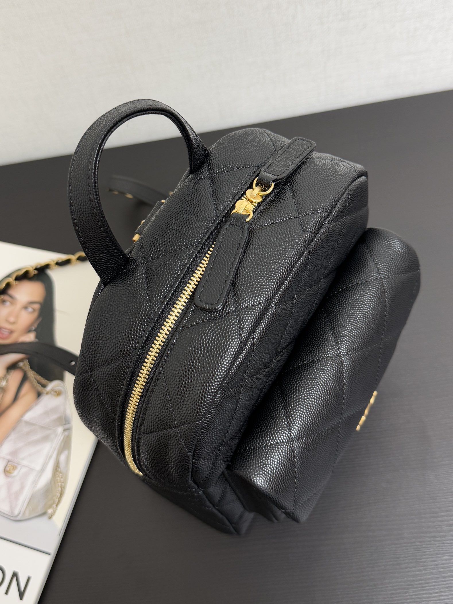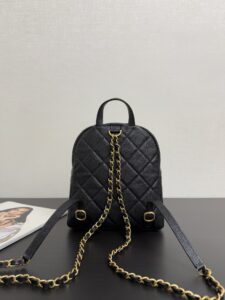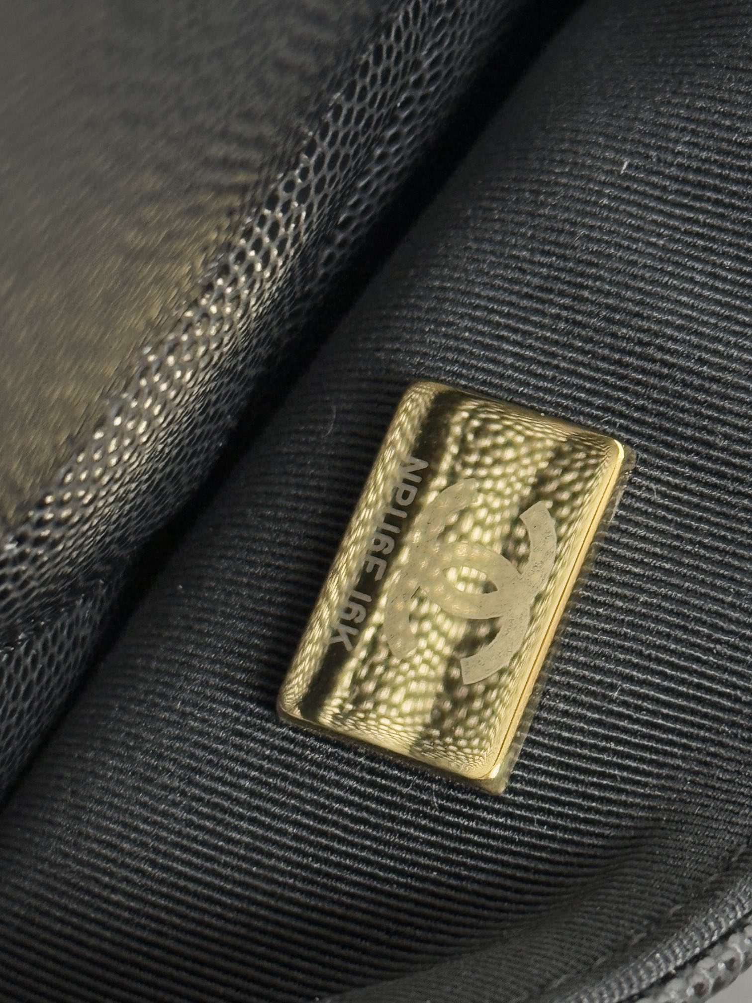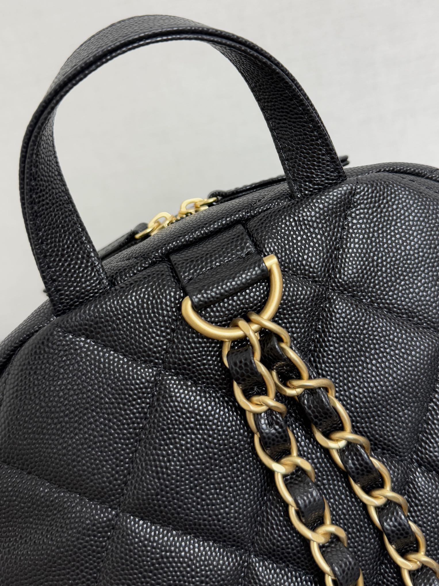 The adjustable shoulder straps combine leather and chain detailing—an iconic CHANEL element—offering comfortable wear and versatile styling options (wear as a backpack or adjust for crossbody use).