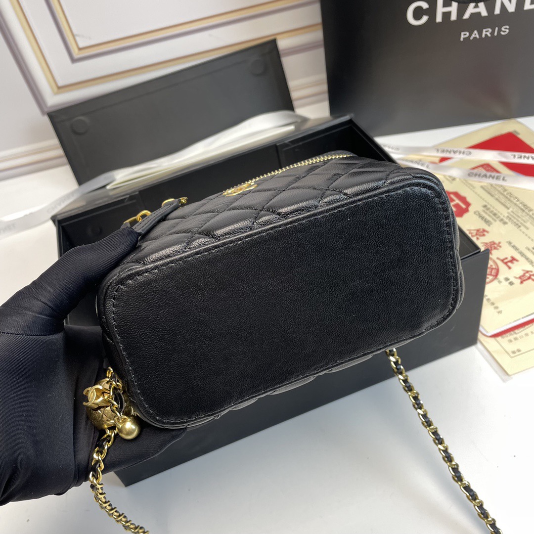 Shiny gold-tone hardware (including the iconic interlocking “CC” logo and a textured spherical charm on the chain strap)