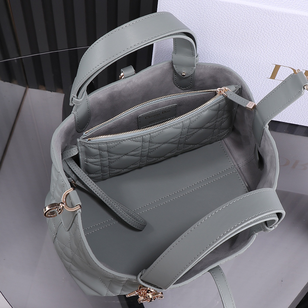 Material & Color: Both pieces are crafted from smooth sage green leather with Dior’s iconic cannage quilting (diamond-stitch pattern) in tonal thread, creating a plush, cohesive look.