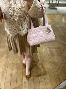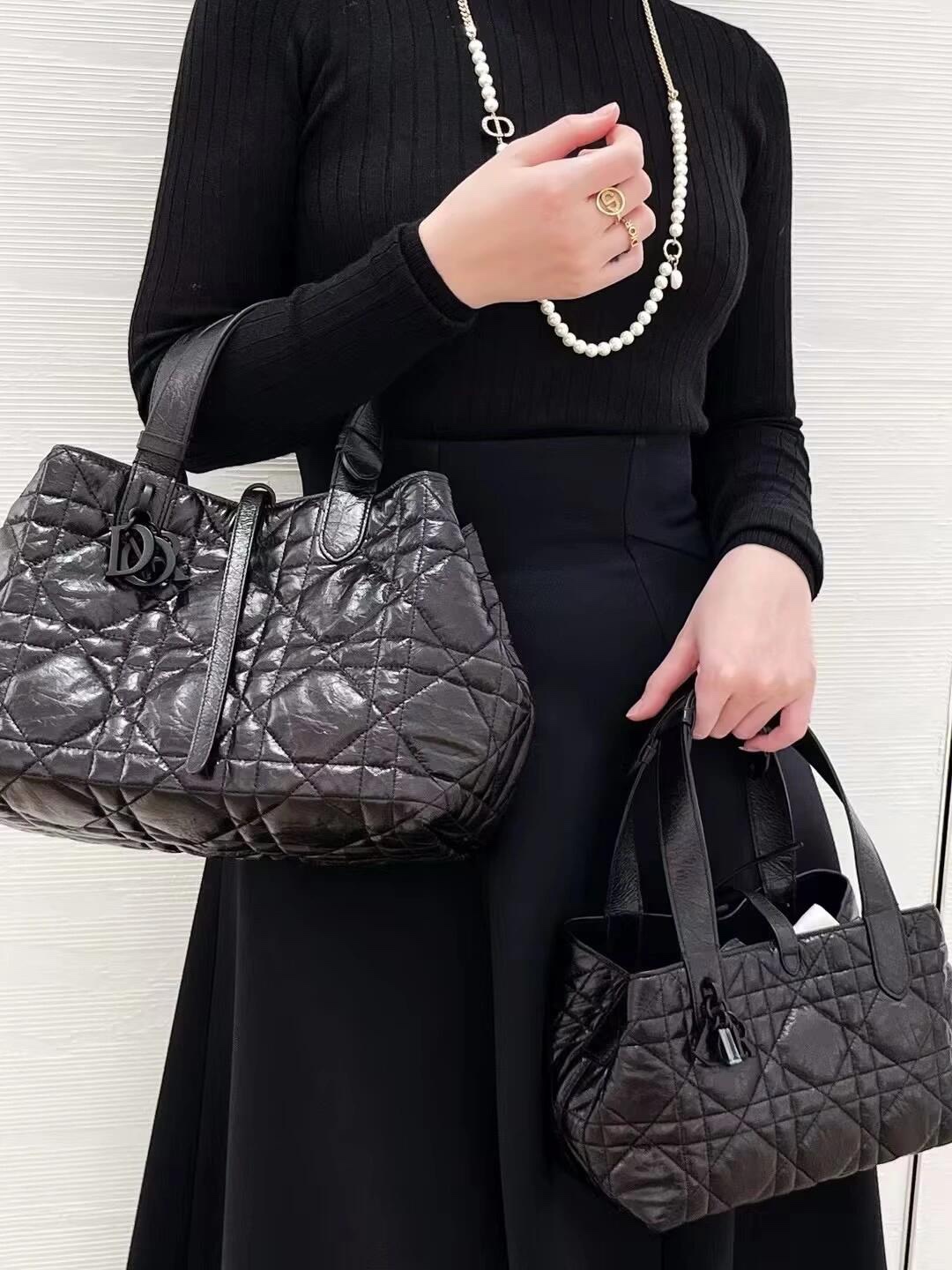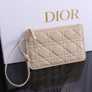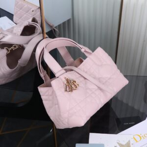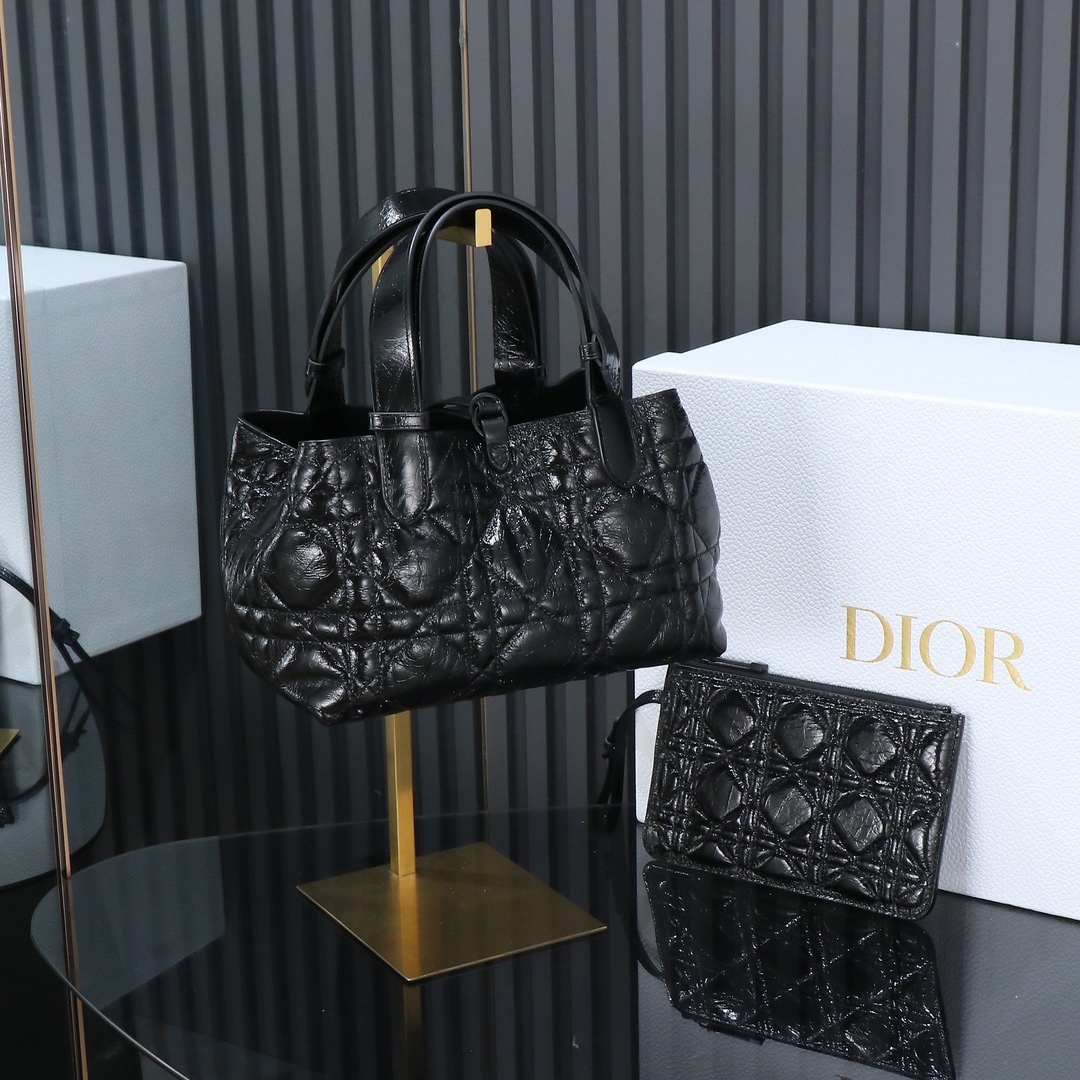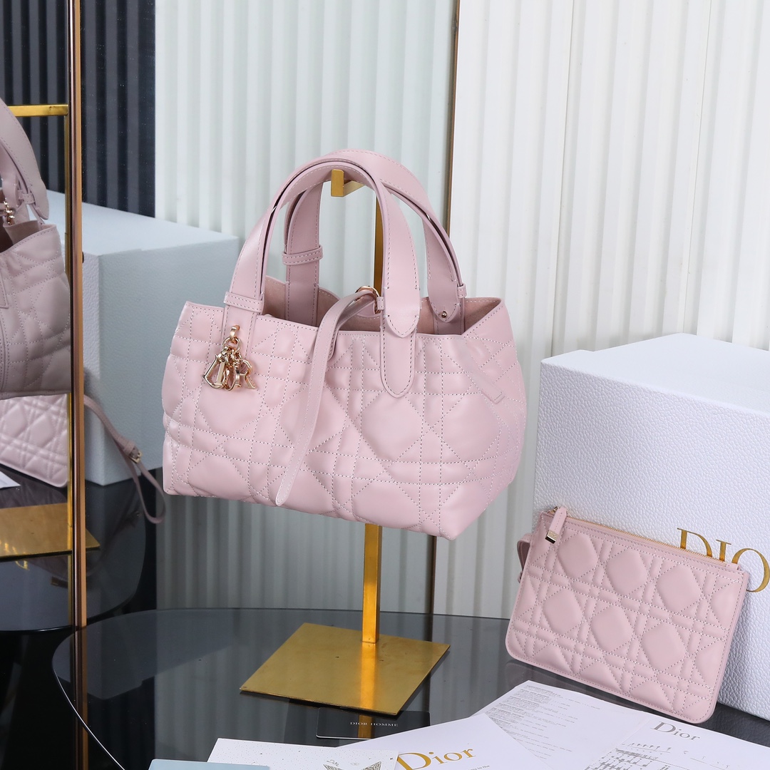 Hardware: Polished gold-tone hardware includes a “D.I.O.R” logo charm attached to one handle, plus a magnetic snap closure for secure storage.