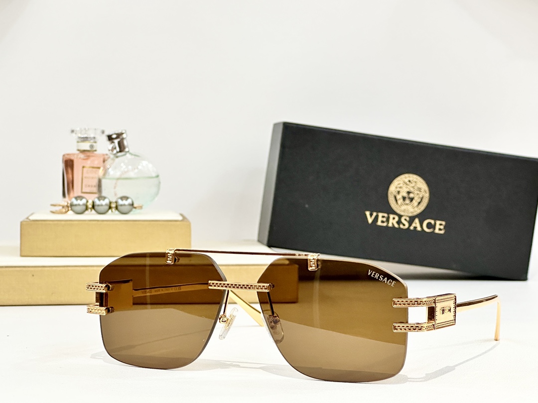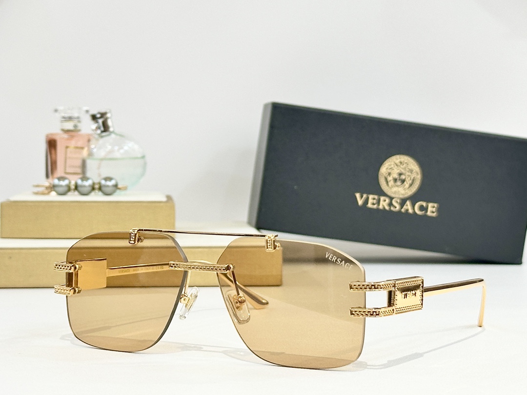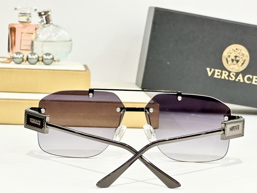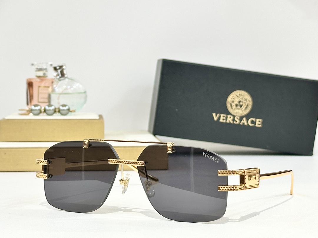 • These are Versace rectangular sunglasses featuring the brand’s signature ornate metal detailing on the frames and temple arms.