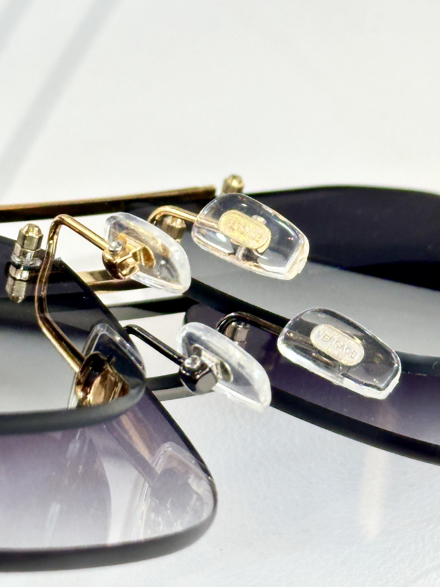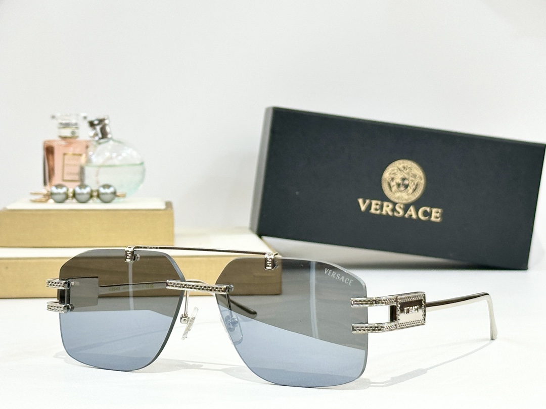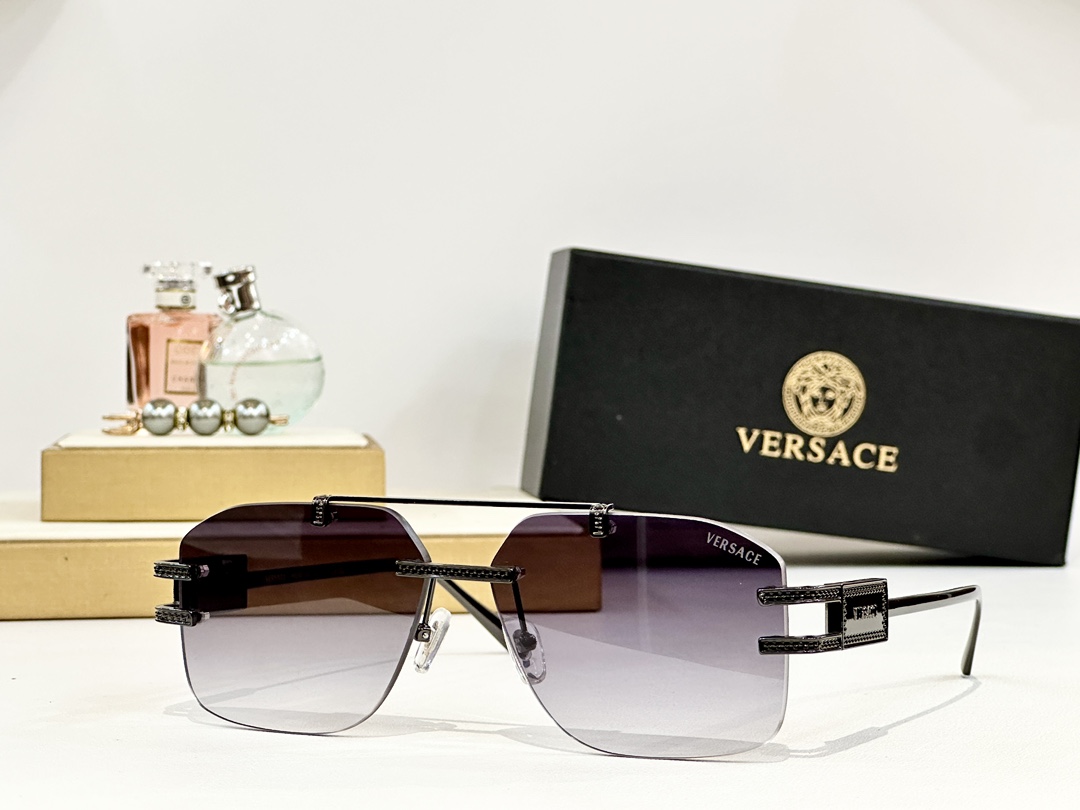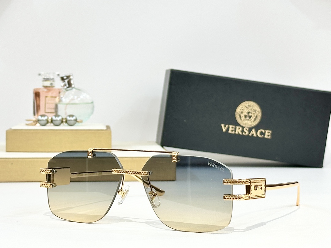 • These are Versace rectangular sunglasses featuring the brand’s signature ornate metal detailing on the frames and temple arms.