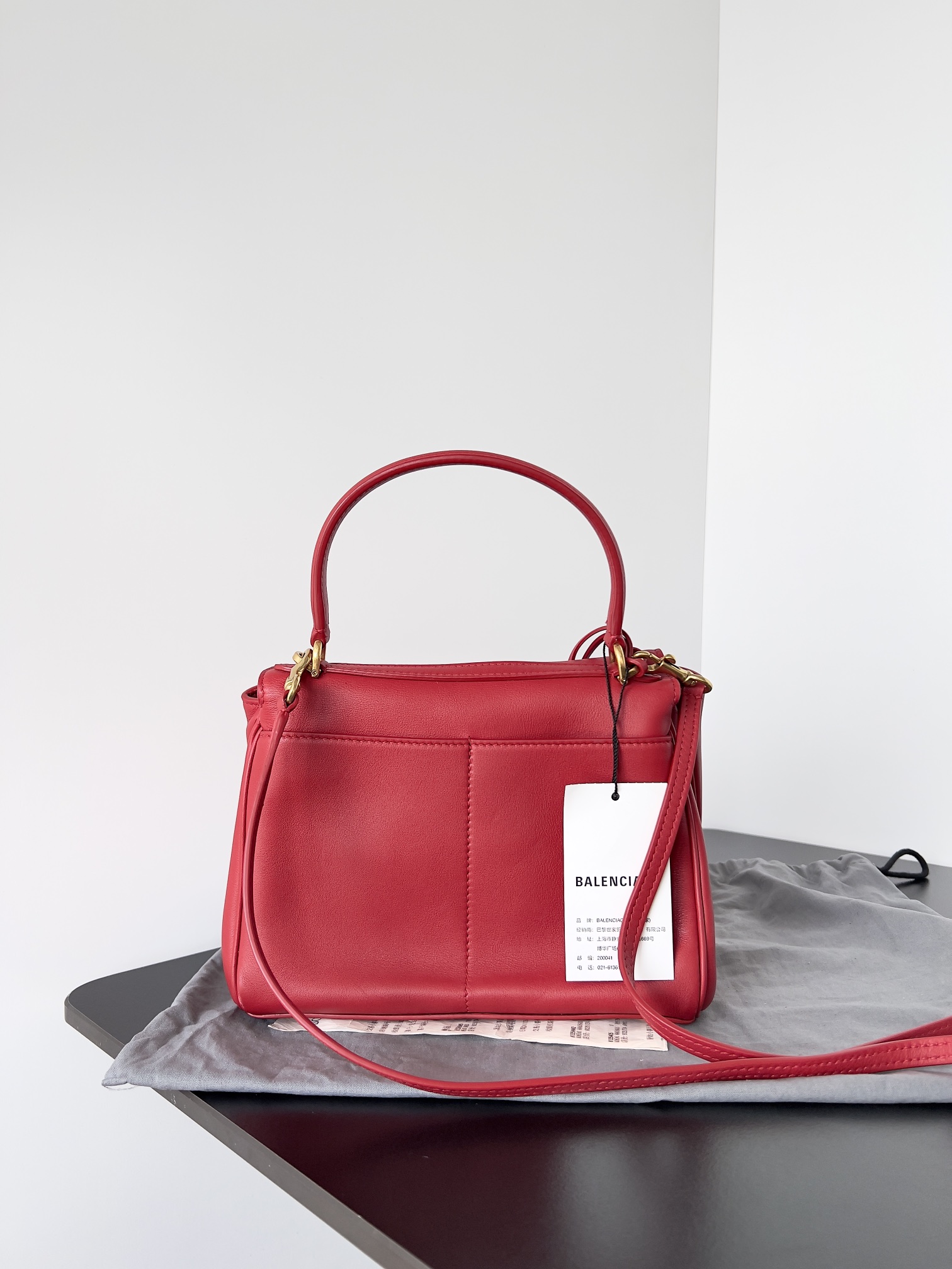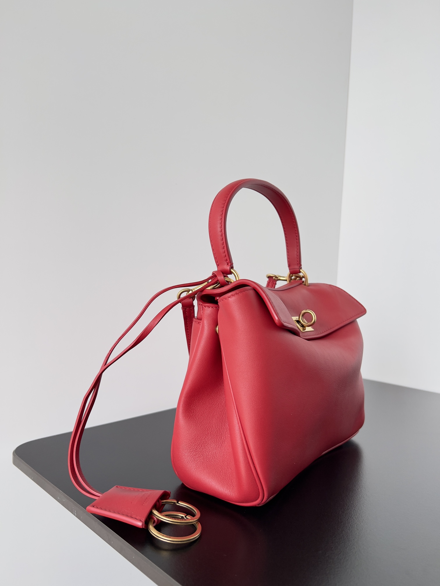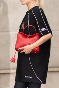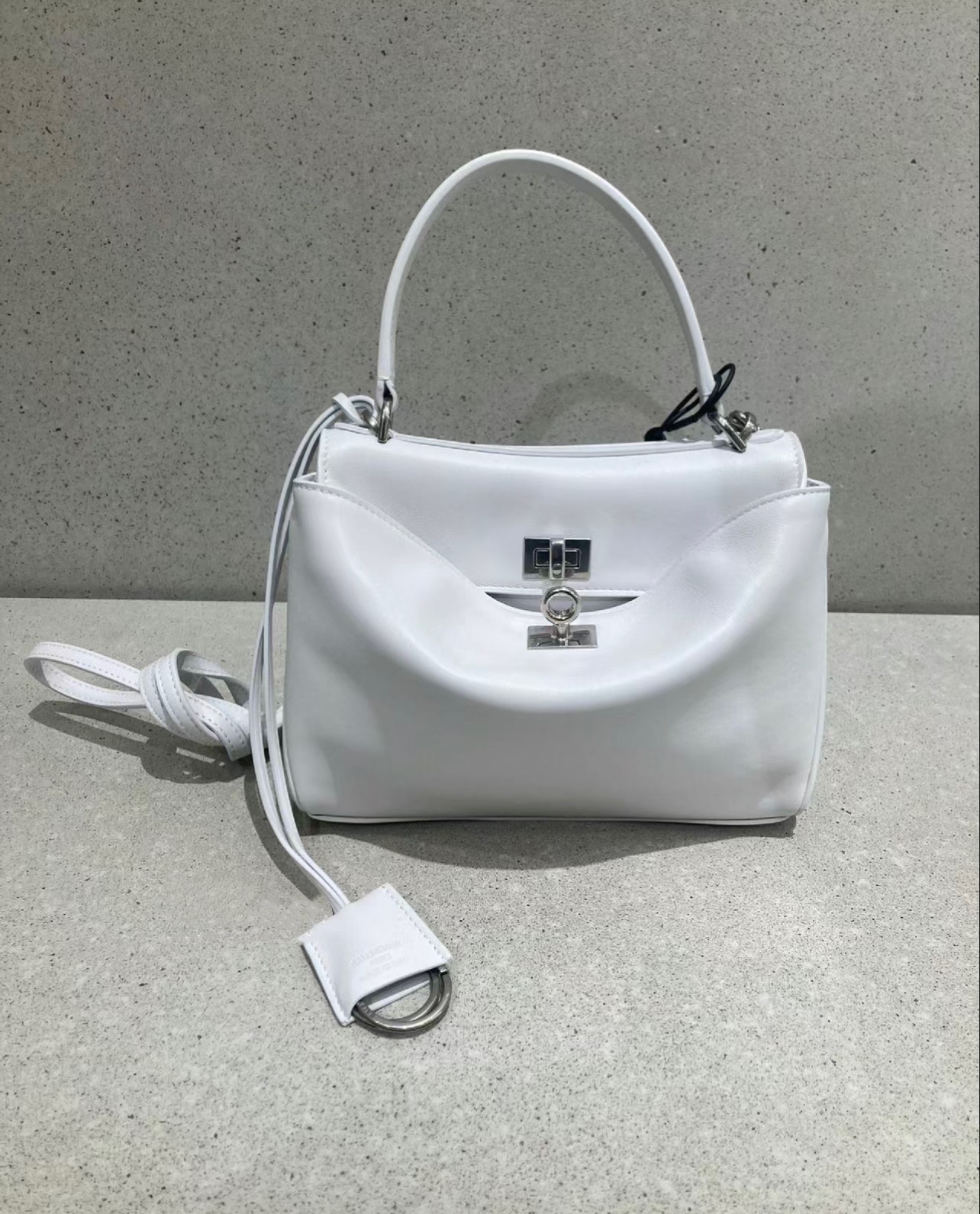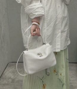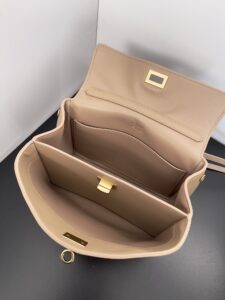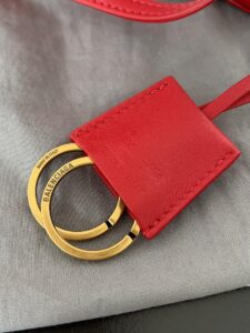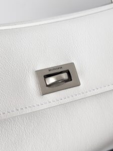 A curved top handle for elegant hand carry, plus a detachable thin leather shoulder strap (adorned with Balenciaga’s signature double-ring charm) for crossbody/shoulder wear.