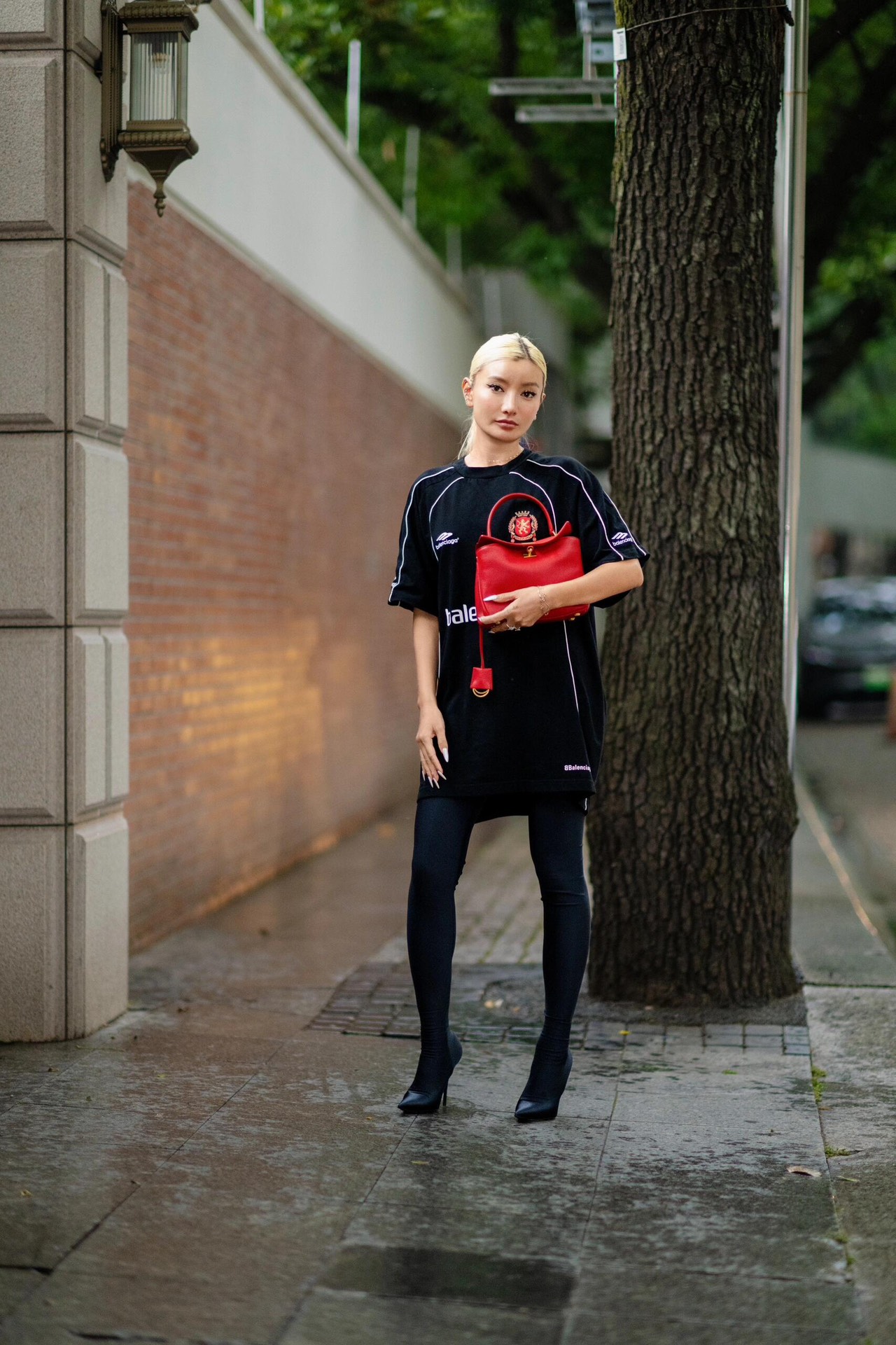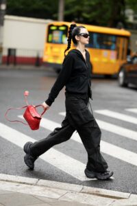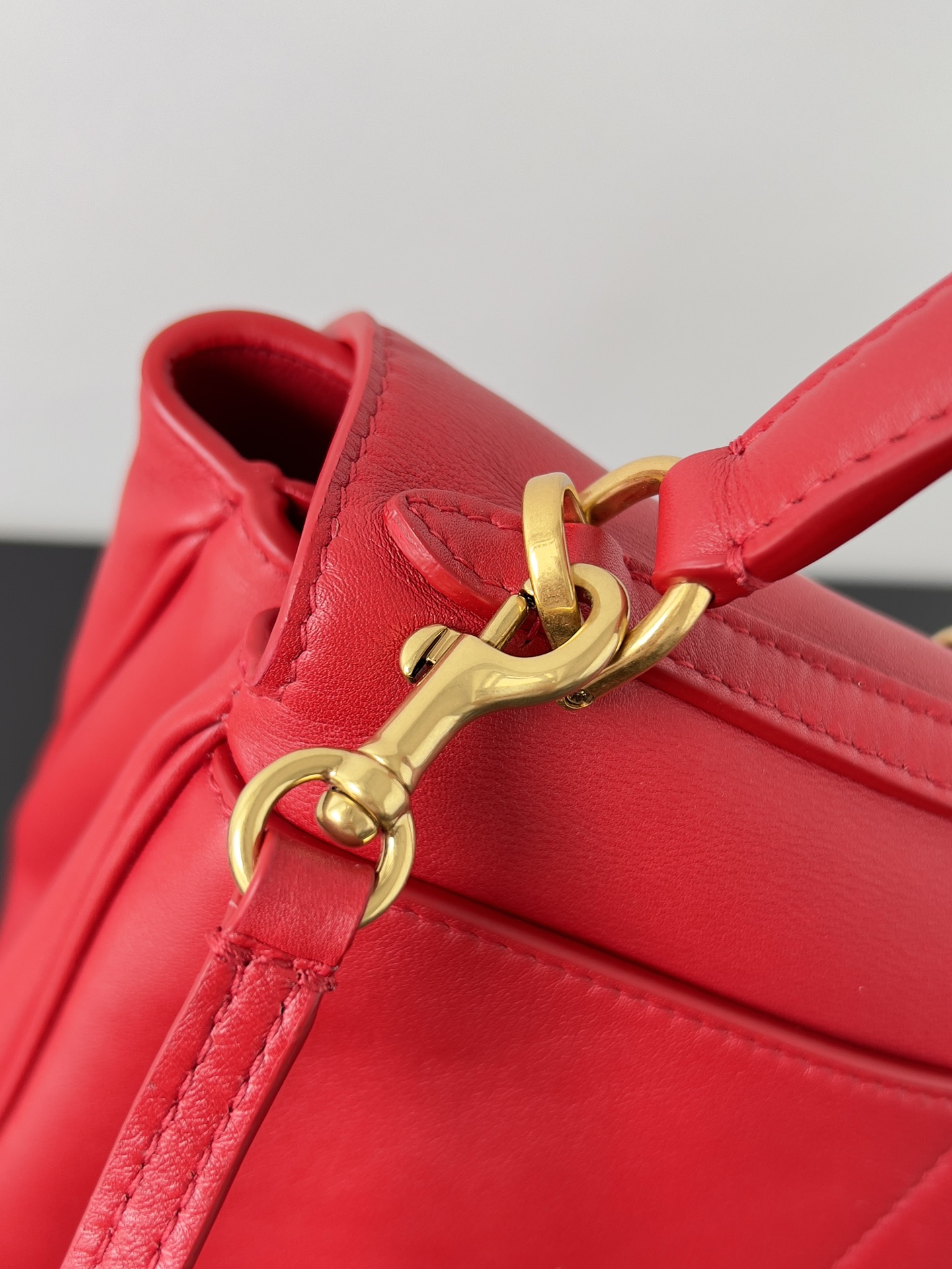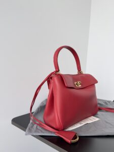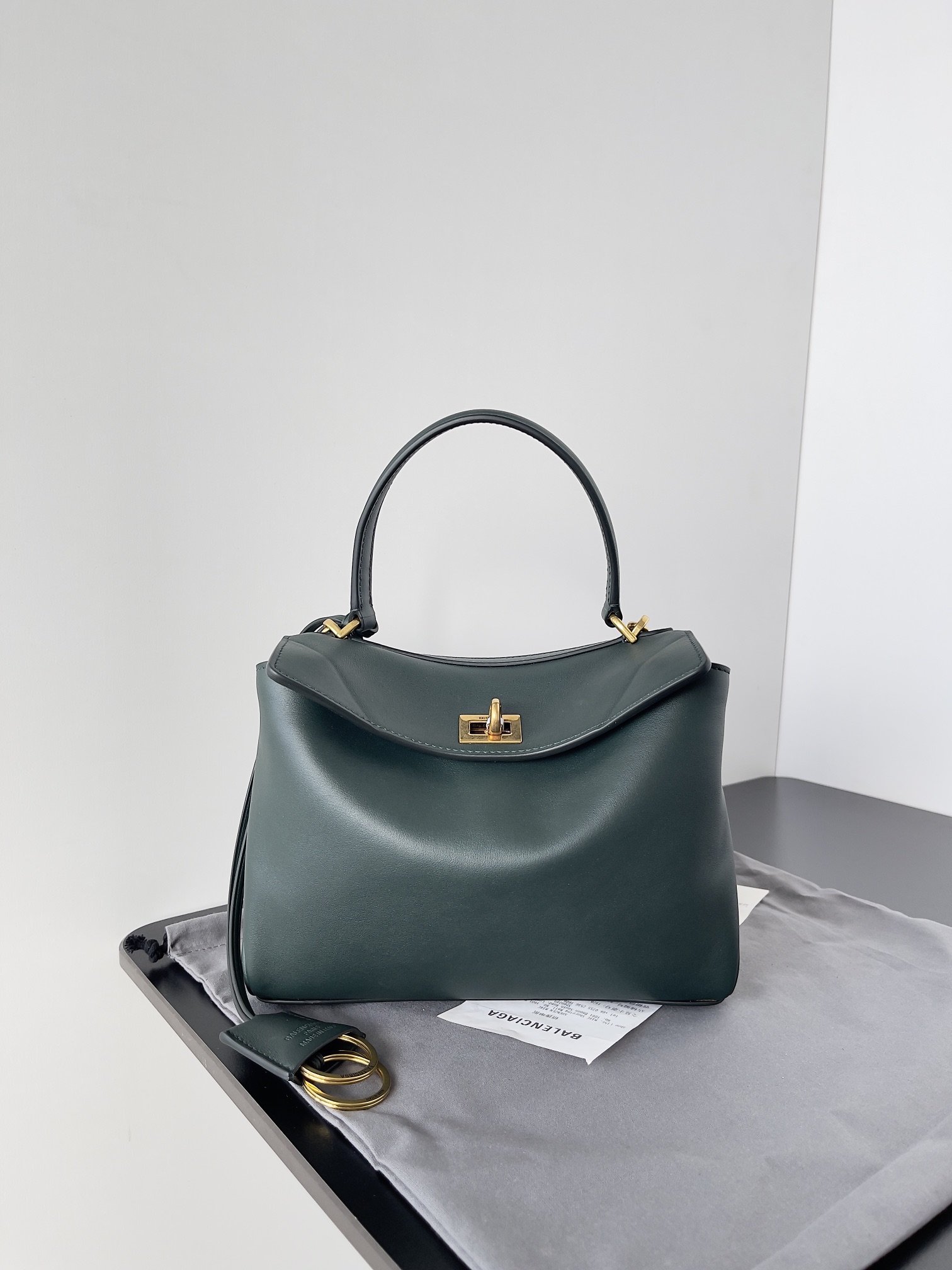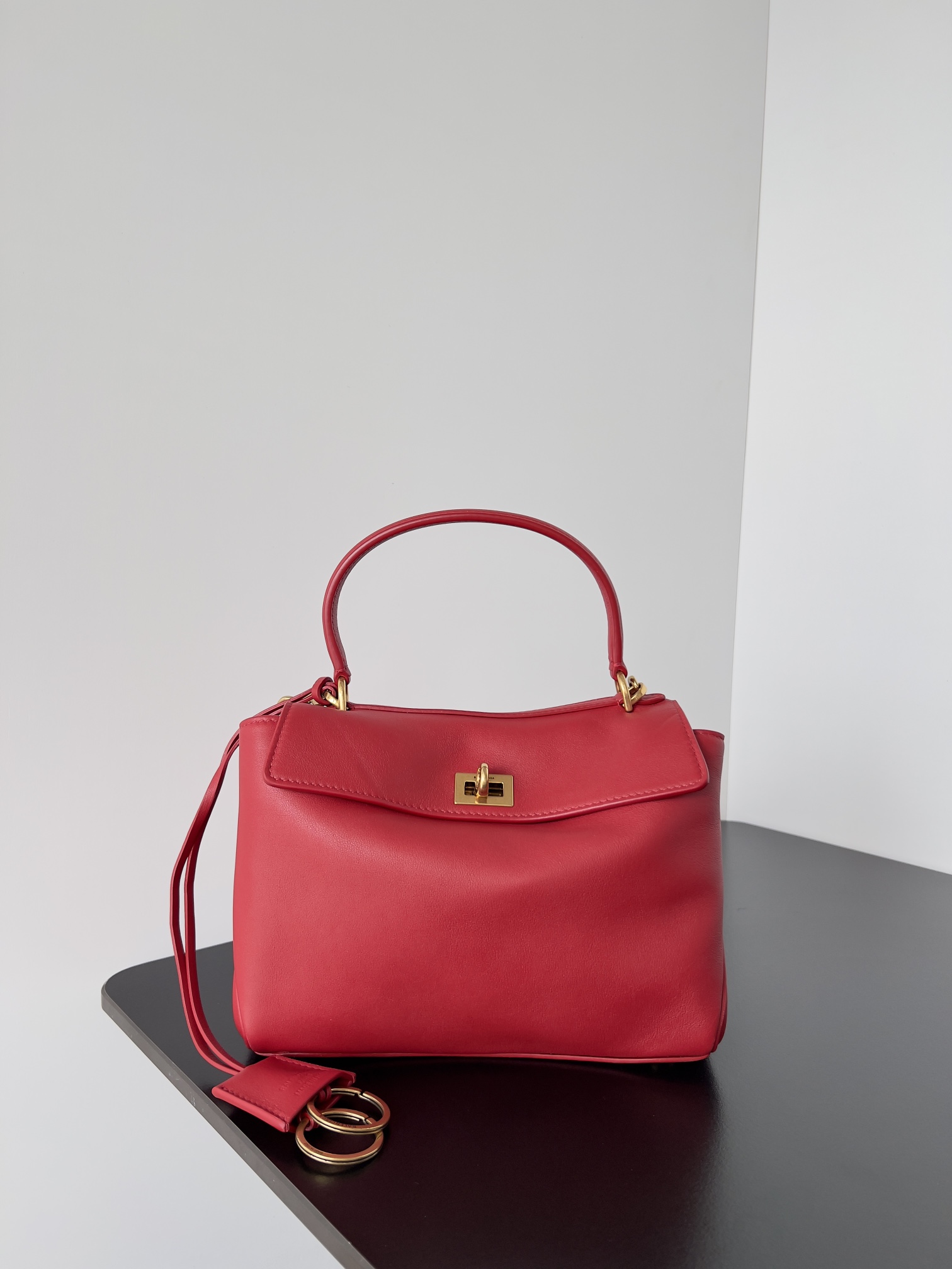 A curved top handle for elegant hand carry, plus a detachable thin leather shoulder strap (adorned with Balenciaga’s signature double-ring charm) for crossbody/shoulder wear.