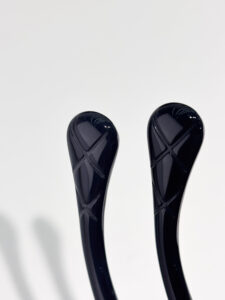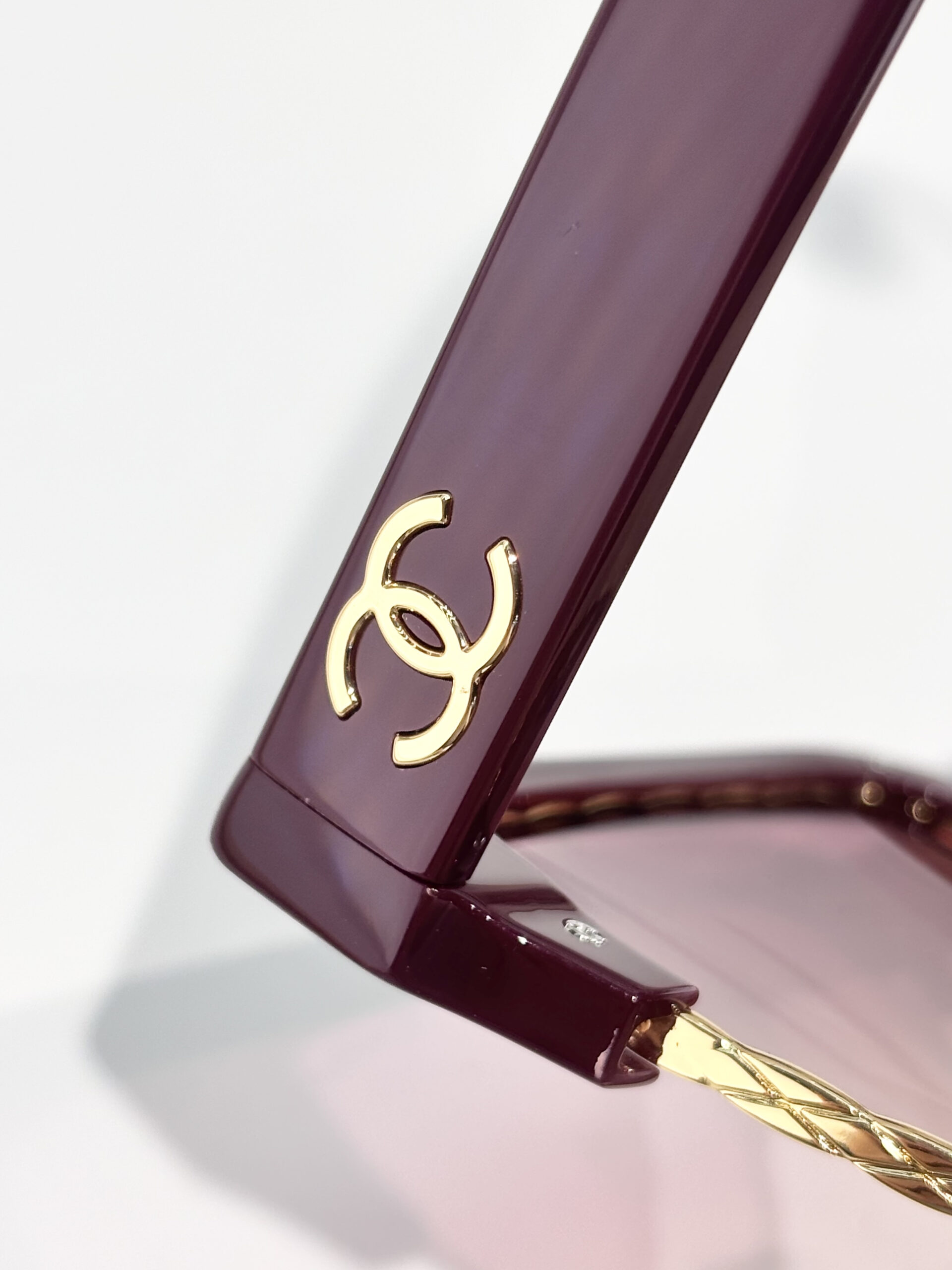 Each piece is crafted from high-gloss acetate, accented with polished metal detailing along the lower rim of the lenses. The iconic CC logo is prominently displayed on the temples, serving as a hallmark of the brand’s heritage.
