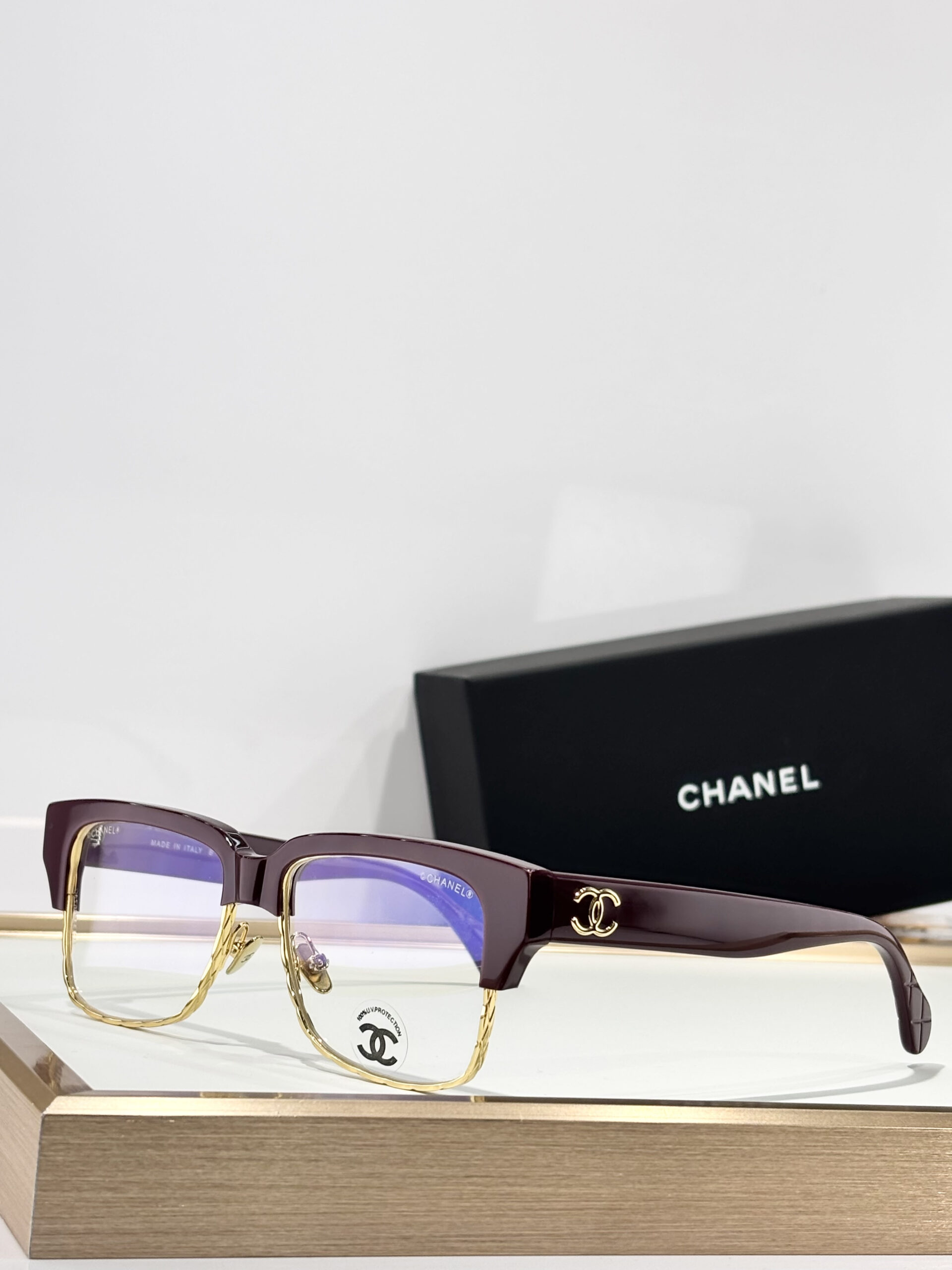 This collection from CHANEL features a bold, rectangular half-rim design that balances retro-inspired style with modern luxury.