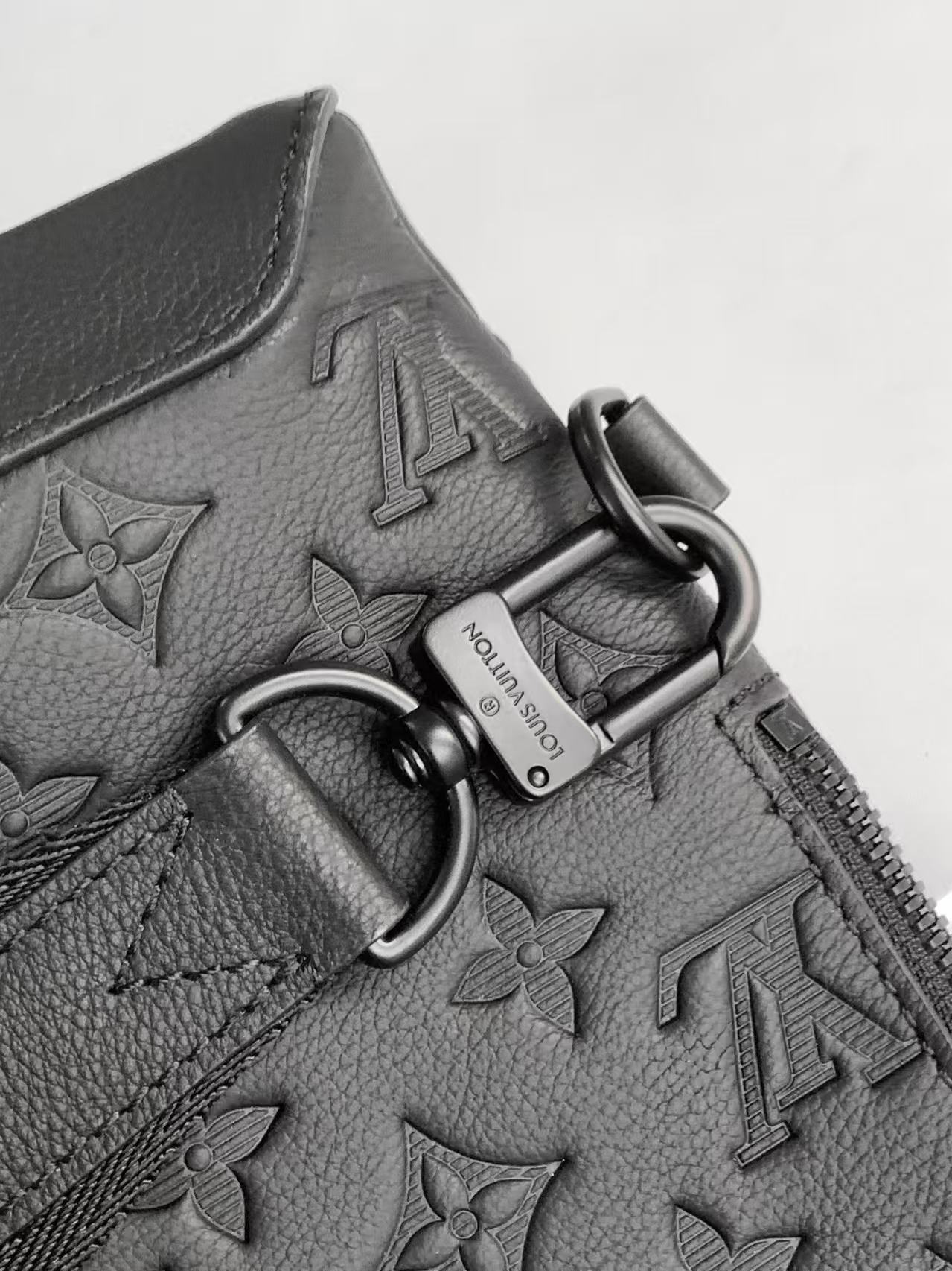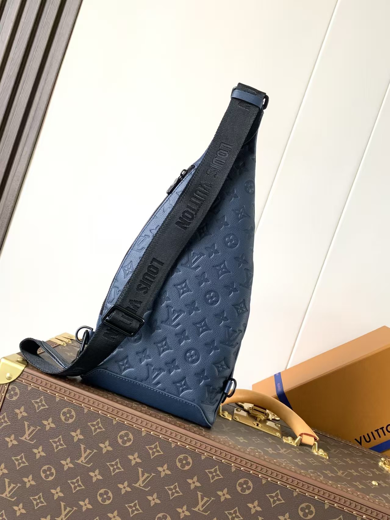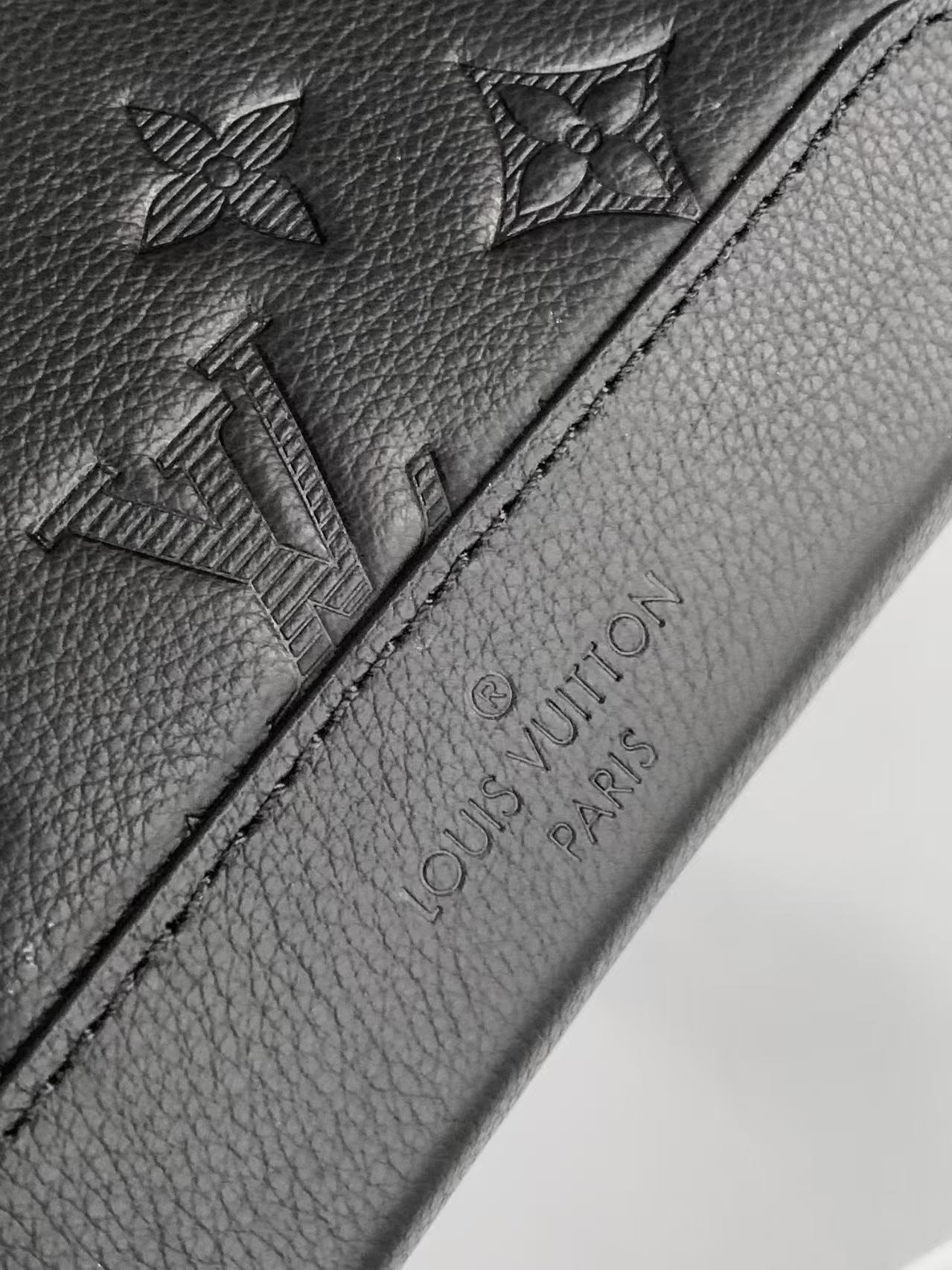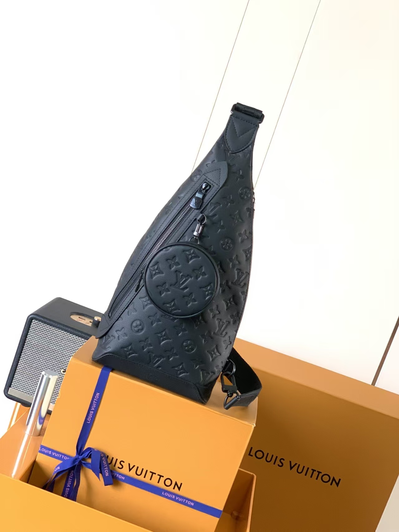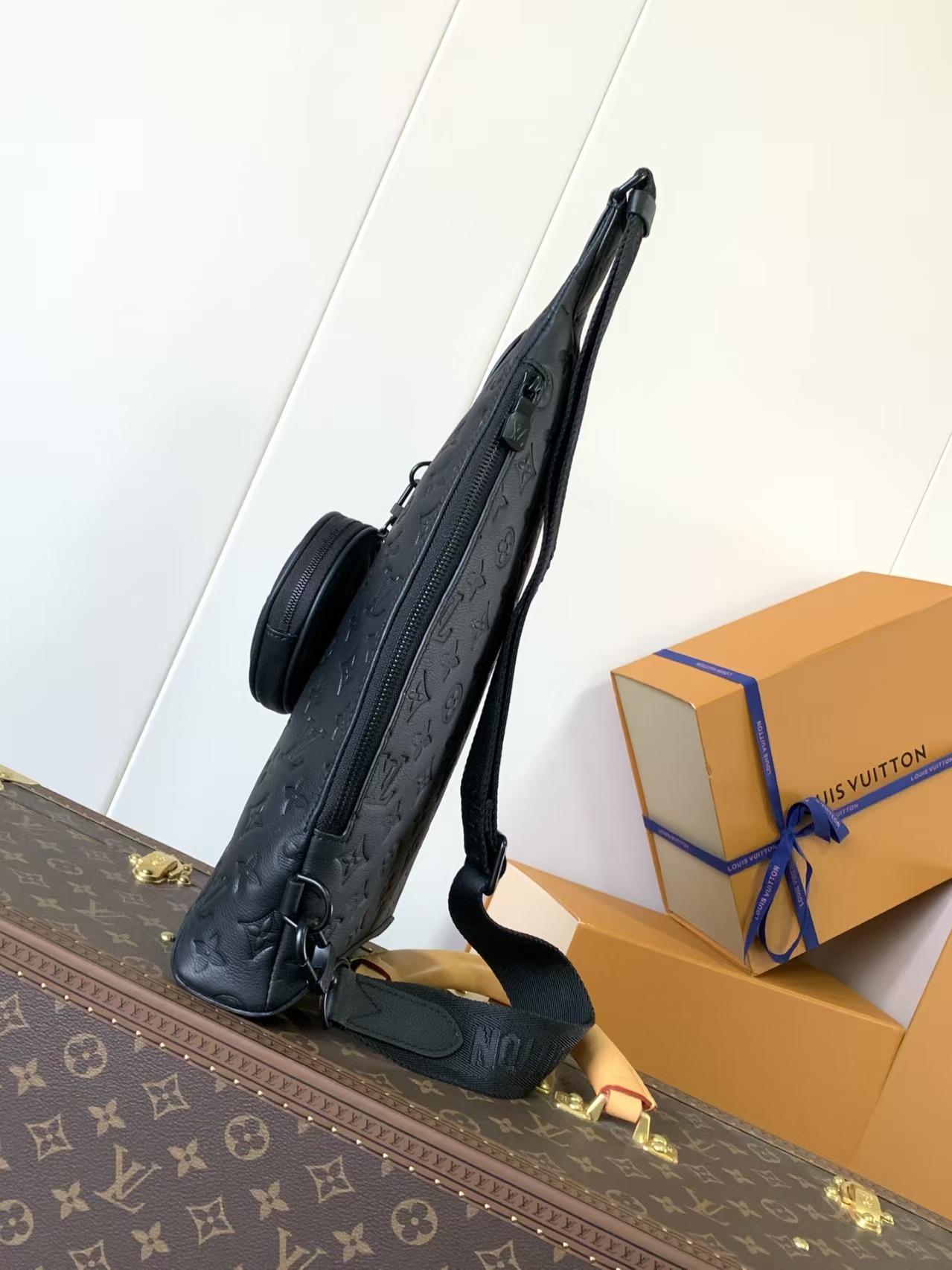 This product is a Louis Vuitton sling bag crafted from black embossed Monogram leather, showcasing the brand’s iconic pattern in a textured finish.