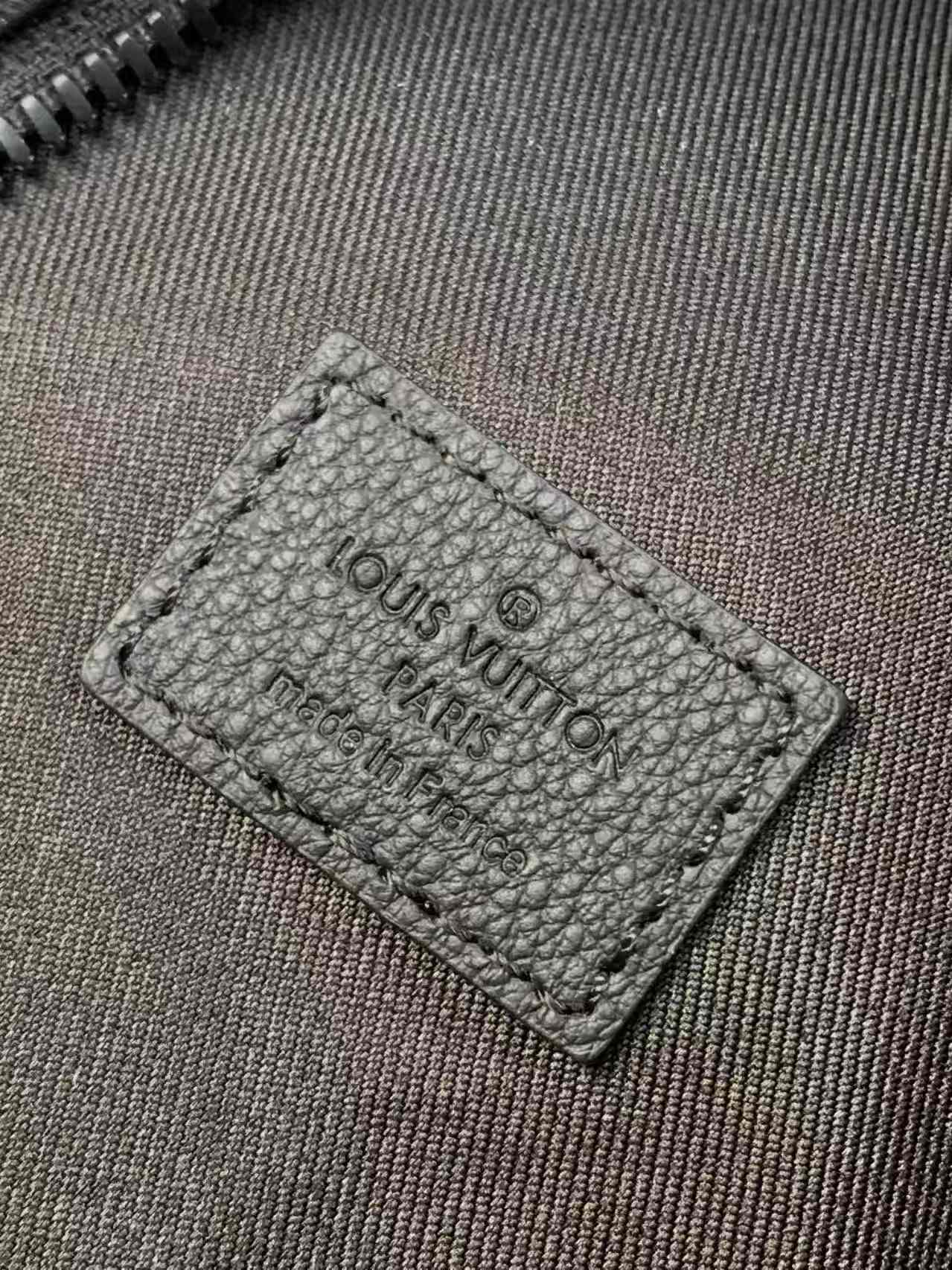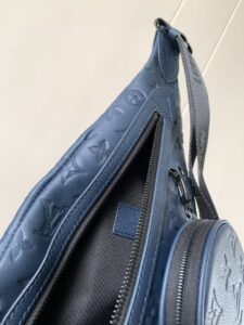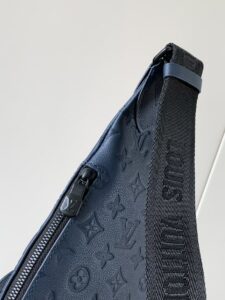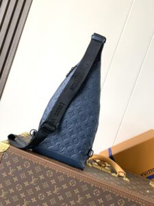 It features a sleek, ergonomic design with an adjustable webbing strap that has the “Louis Vuitton” logo printed on it, allowing for comfortable cross-body wear.